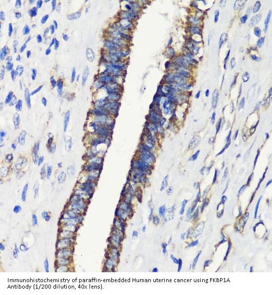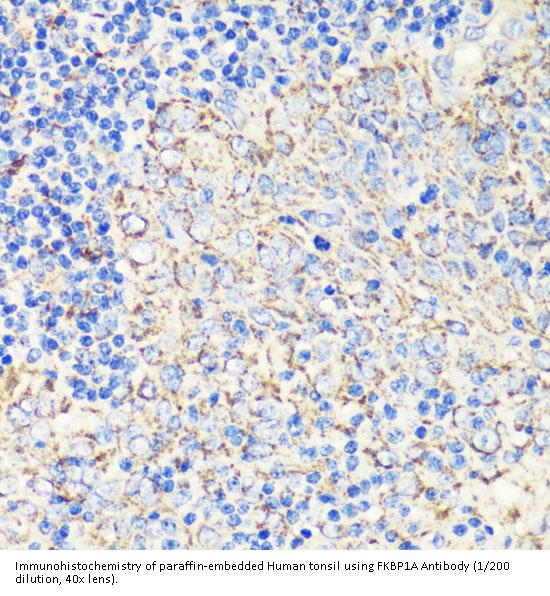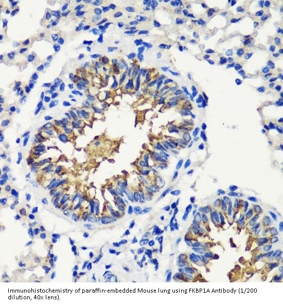 FKBP1A Antibody is a Rabbit Polyclonal antibody against FKBP1A. The protein encoded by this gene is a member of the immunophilin protein family, which play a role in immunoregulation and basic cellular processes involving protein folding and trafficking. The protein is a cis-trans prolyl isomerase that binds the immunosuppressants FK506 and rapamycin. It interacts with several intracellular signal transduction proteins including type I TGF-beta receptor. It also interacts with multiple intracellular calcium release channels, and coordinates multi-protein complex formation of the tetrameric skeletal muscle ryanodine receptor. In mouse, deletion of this homologous gene causes congenital heart disorder known as noncompaction of left ventricular myocardium. Multiple alternatively spliced variants, encoding the same protein, have been identified. The human genome contains five pseudogenes related to this gene, at least one of which is transcribed. [provided by RefSeq, Sep 2008].