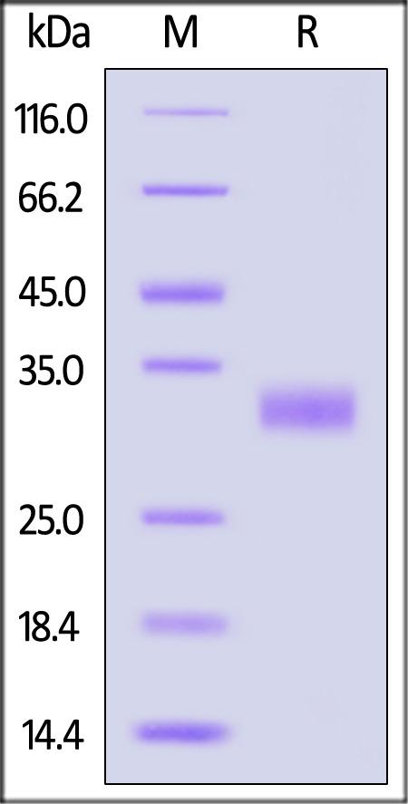 This protein carries a polyhistidine tag at the C-terminus. The protein has a calculated MW of 26.4 kDa. The protein migrates as 30-34 kDa under reducing (R) condition (SDS-PAGE) due to glycosylation.