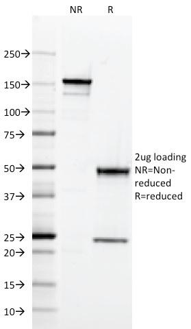 Recognizes a DQ antigen, which is a dimer of 60 kDa. The class II molecule is a heterodimer consisting of an alpha (DQA) and a beta chain (DQB), both anchored in the membrane. It plays a central role in the immune system by presenting peptides derived from extracellular proteins. Class II molecules are expressed in antigen presenting cells (APC: B Lymphocytes, dendritic cells, macrophages). The alpha chain is approximately 33-35 kDa. It is encoded by 5 exons; exon 1 encodes the leader peptide, exons 2 and 3 encode the two extracellular domains, and exon 4 encodes the transmembrane domain and the cytoplasmic tail. Within the DQ molecule both the alpha chain and the beta chain contain the polymorphisms specifying the peptide binding specificities, resulting in up to four different molecules. Typing for these polymorphisms is routinely done for bone marrow transplantation.This MAb strongly blocks cytotoxicity activity of T4-positive cytotoxic T cell clones.Primary antibodies are available purified, or with a selection of fluorescent CF® Dyes and other labels. CF® Dyes offer exceptional brightness and photostability. Note: Conjugates of blue fluorescent dyes like CF®405S and CF®405M are not recommended for detecting low abundance targets, because blue dyes have lower fluorescence and can give higher non-specific background than other dye colors.