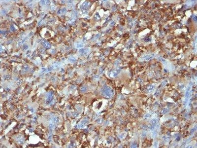 This antibody recognizes a glycoprotein of 110 kDa, which is identified as CD68. It is important for identifying macrophages in tissue sections. It stains macrophages in a wide variety of human tissues, including Kupffer cells and macrophages in the red pulp of the spleen, in lamina propria of the gut, in lung alveoli, and in bone marrow. It reacts with myeloid precursors and peripheral blood granulocytes. It also reacts with plasmacytoid T cells, which are supposed to be of monocyte/macrophage origin. It shows strong granular cytoplasmic staining of chronic and acute myeloid leukemia and also reacts with rare cases of true histiocytic neoplasia. Lymphomas are negative or show few granules.Primary antibodies are available purified, or with a selection of fluorescent CF® Dyes and other labels. CF® Dyes offer exceptional brightness and photostability. Note: Conjugates of blue fluorescent dyes like CF®405S and CF®405M are not recommended for detecting low abundance targets, because blue dyes have lower fluorescence and can give higher non-specific background than other dye colors.