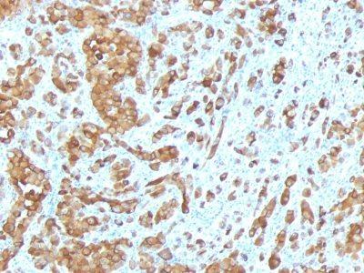 This antibody recognizes a protein doublet of 20-22 kDa, identified as MART-1 (Melanoma Antigen Recognized by T cells 1) or Melan-A. MART-1 is a newly identified melanocyte differentiation antigen recognized by autologous cytotoxic T lymphocytes. Seven other melanoma associated antigens recognized by autologous cytotoxic T cells include MAGE-1, MAGE-3, tyrosinase, gp100, gp75, BAGE-1, and GAGE-1. Subcellular fractionation shows that MART-1 is present in melanosomes and endoplasmic reticulum. This MAb labels melanomas and other tumors showing melanocytic differentiation. It is also a useful positive-marker for angiomyolipomas. It does not stain tumor cells of epithelial, lymphoid, glial, or mesenchymal origin.Primary antibodies are available purified, or with a selection of fluorescent CF® Dyes and other labels. CF® Dyes offer exceptional brightness and photostability. Note: Conjugates of blue fluorescent dyes like CF®405S and CF®405M are not recommended for detecting low abundance targets, because blue dyes have lower fluorescence and can give higher non-specific background than other dye colors.