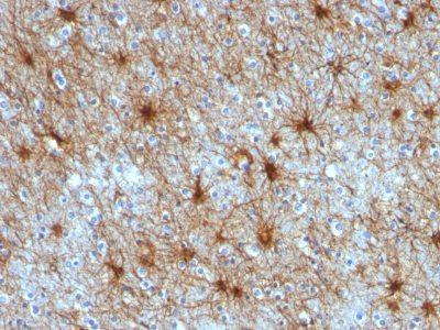 This MAb recognizes a protein of ~50 kDa which is identified as Glial Fibrillary Acidic Protein (GFAP). It shows no cross-reaction with other intermediate filament proteins. GFAP is specifically found in astroglia. GFAP is a very popular marker for localizing benign astrocyte and neoplastic cells of glial origin in the central nervous system. Antibody to GFAP is useful in differentiating primary gliomas from metastatic lesions in the brain and for documenting astrocytic differentiation in tumors outside the CNS.Primary antibodies are available purified, or with a selection of fluorescent CF® Dyes and other labels. CF® Dyes offer exceptional brightness and photostability. Note: Conjugates of blue fluorescent dyes like CF®405S and CF®405M are not recommended for detecting low abundance targets, because blue dyes have lower fluorescence and can give higher non-specific background than other dye colors.