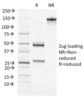For coating for ELISA, order Ab without BSA|Higher concentration may be required for direct detection using primary antibody conjugates than for indirect detection with secondary antibody|Optimal dilution and staining procedure for a specific application should be determined by user|Recommended starting concentrations for titration are 1-2 ug/mL for most applications, or 1 ug/million cells/100 uL for flow cytometry