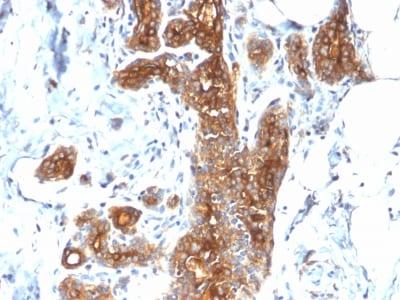 This MAb reacts with MUC1, a large transmembrane glycoprotein expressed on the ductal surface of normal glandular epithelia. It is used as tracer agent in CA15.3 assays. The extracellular domain of MUC1 largely consists of a highly conserved, O-glycosylated 20 amino acids tandem repeat which can occur 30-100 times per molecule depending on the length of the allele involved. In the vast majority of human carcinomas this protein is up-regulated and poorly glycosylated and appears on the cell surface in a non-polarized fashion. The dominant epitope of this MAb involves both amino acids as well as sugar moieties. Its epitope is destroyed by desialylation i.e. treatment with Neuraminidase.Primary antibodies are available purified, or with a selection of fluorescent CF® Dyes and other labels. CF® Dyes offer exceptional brightness and photostability. Note: Conjugates of blue fluorescent dyes like CF®405S and CF®405M are not recommended for detecting low abundance targets, because blue dyes have lower fluorescence and can give higher non-specific background than other dye colors.
