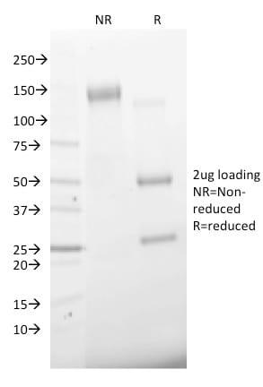 Higher concentration may be required for direct detection using primary antibody conjugates than for indirect detection with secondary antibody|Flow cytometry: 0.5-1 ug/million cells|Immunofluorescence: 0.5-1 ug/mL|Immunohistology (formalin): 0.5-1 ug/mL for 30 minutes at RT|Staining of formalin-fixed tissues is enhanced by boiling tissue sections in 10 mM citrate buffer pH 6.0 for 10-20 minutes followed by cooling at RT for 20 minutes|Western: 0.5-1 ug/mL|Optimal dilution for a specific application should be determined by user