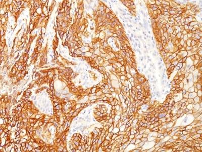 EGFR is type I receptor tyrosine kinase with sequence homology to erbB-1, -2, -3 -4 or HER-1, -2, -3 -4. It binds to Epidermal Growth Factor (EGF), Transforming Growth Factor-a (TGF-a), Heparin-binding EGF (HB-EGF), amphiregulin, betacellulin and epiregulin. EGFR is overexpressed in tumors of breast, brain, bladder, lung, gastric, head & neck, esophagus, cervix, vulva, ovary, and endometrium. It is predominantly present in squamous cell carcinomas.Primary antibodies are available purified, or with a selection of fluorescent CF® Dyes and other labels. CF® Dyes offer exceptional brightness and photostability. Note: Conjugates of blue fluorescent dyes like CF®405S and CF®405M are not recommended for detecting low abundance targets, because blue dyes have lower fluorescence and can give higher non-specific background than other dye colors.
