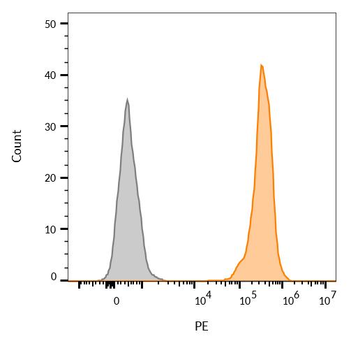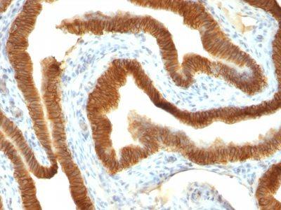 This antibody reacts with the first EGF repeat in the extracellular domain of Ep-CAM. It is a 40-43 kDa transmembrane epithelial glycoprotein, also identified as epithelial specific antigen (ESA), or epithelial cellular adhesion molecule (Ep-CAM). It is expressed on baso-lateral cell surface in most simple epithelia and a vast majority of carcinomas with the exception of adult squamous epithelium, hepatocytes and gastric epithelial cells. This antibody has been used to distinguish adenocarcinoma from pleural mesothelioma and hepatocellular carcinoma. This antibody is also useful in distinguishing serous carcinomas of the ovary from mesothelioma.Primary antibodies are available purified, or with a selection of fluorescent CF® Dyes and other labels. CF® Dyes offer exceptional brightness and photostability. Note: Conjugates of blue fluorescent dyes like CF®405S and CF®405M are not recommended for detecting low abundance targets, because blue dyes have lower fluorescence and can give higher non-specific background than other dye colors.