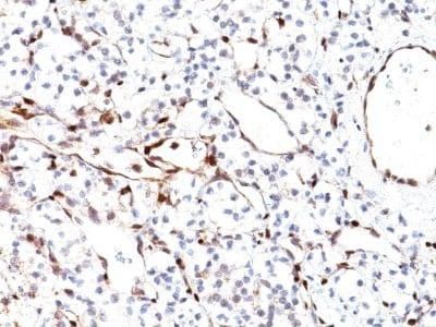 Higher concentration may be required for direct detection using primary antibody conjugates than for indirect detection with secondary antibody|Immunohistology (formalin): 1-2 ug/mL for 30 minutes at RT|Staining of formalin-fixed tissues requires boiling tissue sections in 10 mM citrate buffer, pH 6.0, for 10-20 minutes followed by cooling at RT for 20 minutes|Optimal dilution for a specific application should be determined by user