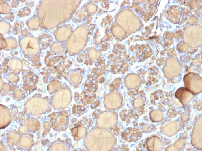 Thyroglobulin is a 660 kDa dimeric pre-protein with mutiple glycosylation sites. It is produced by and processed within the thyroid gland to produce the hormone thyroxine and triiodothyronine. Prior to forming dimers, thyroglobulin monomers undergo conformational maturation in the endoplasmic reticulation. The vast majority of follicular carcinomas of the thyroid will give positive immunoreactivity for anti-thyroglobulin even though sometimes only focally. Poorly differentiated carcinomas of the thyroid are frequently anti-thyroglobulin negative. Adenocarcinomas of other-than-thyroid origin do not react with this antibody. This antibody is useful in identification of thyroid carcinoma of the papillary and follicular types. Presence of thyroglobulin in metastatic lesions establishes the thyroid origin of tumor. Anti-thyroglobulin, combined with anti-calcitonin, can identify medullary carcinomas of the thyroid. Furthermore, anti-thyroglobulin, combined with anti-TTF1, can be a reliable marker to differentiate between primary thyroid and lung neoplasms. Primary antibodies are available purified, or with a selection of fluorescent CF® Dyes and other labels. CF® Dyes offer exceptional brightness and photostability. Note: Conjugates of blue fluorescent dyes like CF®405S and CF®405M are not recommended for detecting low abundance targets, because blue dyes have lower fluorescence and can give higher non-specific background than other dye colors.