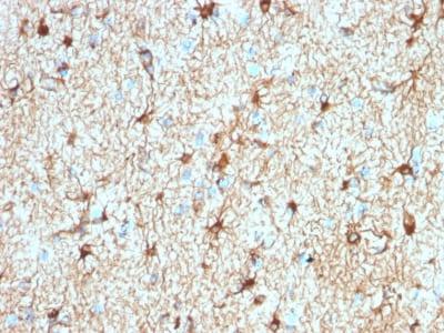 This MAb recognizes a protein of ~50 kDa which is identified as Glial Fibrillary Acidic Protein (GFAP). It shows no cross-reaction with other intermediate filament proteins. GFAP is specifically found in astroglia. GFAP is a very popular marker for localizing benign astrocyte and neoplastic cells of glial origin in the central nervous system. Antibody to GFAP is useful in differentiating primary gliomas from metastatic lesions in the brain and for documenting astrocytic differentiation in tumors outside the CNS.