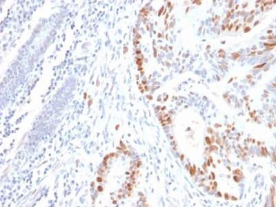 This MAb reacts with an N-terminal epitope (aa 16-25) of both wild type and mutated p53. Mutation and/or allelic loss of p53 is one of the causes of a variety of mesenchymal and epithelial tumors. If it occurs in the germ line, such tumors run in families. In most transformed and tumor cells the concentration of p53 is increased 51000 fold over the minute concentrations (1000 molecules cell) in normal cells, principally due to the increased half-life (4 h) compared to that of the wild-type (20 min). p53 Localizes in the nucleus, but is detectable at the plasma membrane during mitosis and when certain mutations modulate cytoplasmic/nuclear distribution. Mutations arise with an average frequency of 70% but incidence varies from zero in carcinoid lung tumors to 97% in primary melanomas. High concentrations of p53 protein are transiently expressed in human epidermis and superficial dermal fibroblasts following mild ultraviolet irradiation. Positive nuclear staining with p53 antibody has been reported to be a negative prognostic factor in breast carcinoma, lung carcinoma, colorectal, and urothelial carcinoma. Anti-p53 positivity has also been used to differentiate uterine serous carcinoma from endometrioid carcinoma as well as to detect intratubular germ cell neoplasia.Primary antibodies are available purified, or with a selection of fluorescent CF® Dyes and other labels. CF® Dyes offer exceptional brightness and photostability. Note: Conjugates of blue fluorescent dyes like CF®405S and CF®405M are not recommended for detecting low abundance targets, because blue dyes have lower fluorescence and can give higher non-specific background than other dye colors.