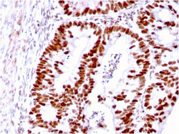 The finding that mutations in DNA mismatch repair genes are associated with hereditary nonpolyposis colorectal cancer (HNPCC) has resulted in considerable interest in the understanding of the mechanism of DNA mismatch repair. Initially, inherited mutations in the MSH2 and MLH1 homologs of the bacterial DNA mismatch repair genes mutS and mutL were demonstrated at high frequency in HNPCC and were shown to be associated with microsatellite instability. A member of the mismatch repair family, GTBP (also designated MSH6), is an MSH2-related protein that binds to DNA containing G/T mismatches. Findings suggest that the mismatch-binding factor in human cells is composed of a heterodimer of GTBP and MSH2. Primary antibodies are available purified, or with a selection of fluorescent CF® Dyes and other labels. CF® Dyes offer exceptional brightness and photostability. Note: Conjugates of blue fluorescent dyes like CF®405S and CF®405M are not recommended for detecting low abundance targets, because blue dyes have lower fluorescence and can give higher non-specific background than other dye colors.