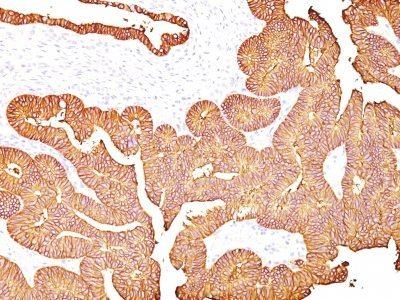 EGP40 is a 40-43 kDa transmembrane epithelial glycoprotein, also identified as epithelial specific antigen (ESA), or epithelial cellular adhesion molecule (Ep-CAM). It is expressed on baso-lateral cell surface in most simple epithelia and a vast majority of carcinomas. This antibody has been used to distinguish adenocarcinoma from pleural mesothelioma and hepatocellular carcinoma. This antibody is also useful in distinguishing serous carcinomas of the ovary from mesothelioma.Primary antibodies are available purified, or with a selection of fluorescent CF® Dyes and other labels. CF® Dyes offer exceptional brightness and photostability. Note: Conjugates of blue fluorescent dyes like CF®405S and CF®405M are not recommended for detecting low abundance targets, because blue dyes have lower fluorescence and can give higher non-specific background than other dye colors.