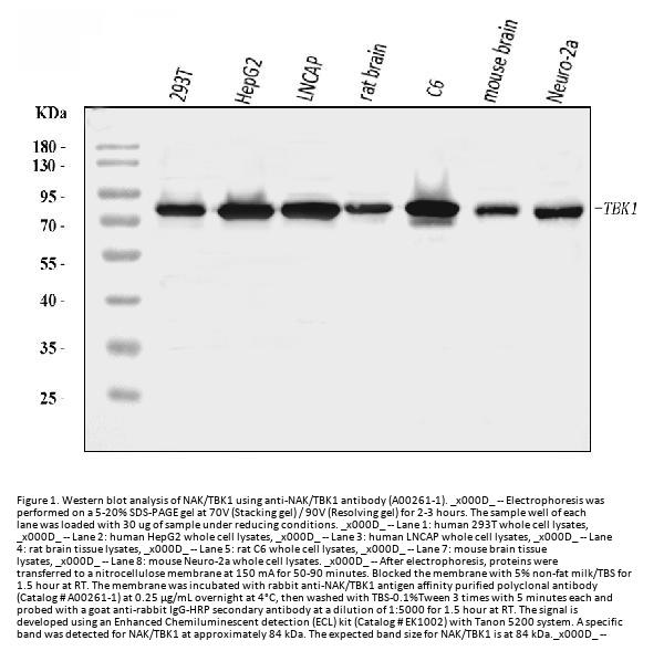 Boster Bio Anti-NAK/TBK1 Antibody Picoband® catalog # A00261-1. Tested in ELISA, IHC, WB applications. This antibody reacts with Human, Mouse, Rat. The brand Picoband indicates this is a premium antibody that guarantees superior quality, high affinity, and strong signals with minimal background in Western blot applications. Only our best-performing antibodies are designated as Picoband, ensuring unmatched performance.