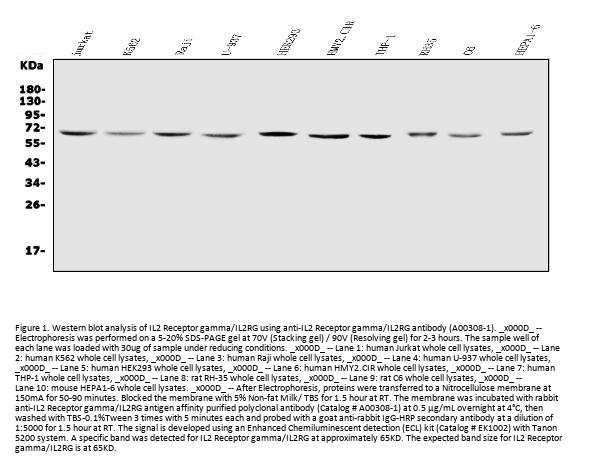 A synthetic peptide corresponding to a sequence at the N-terminus of human IL2 Receptor gamma/IL2RG, which shares 78.9% amino acid (aa) sequence identity with both mouse and rat IL2 Receptor gamma/IL2RG.