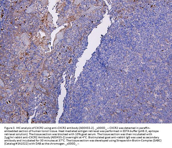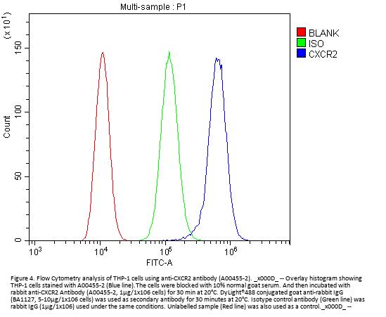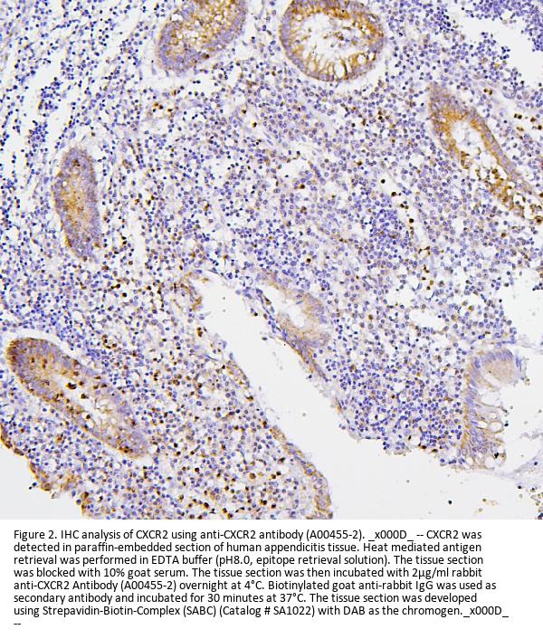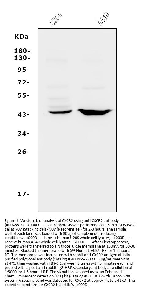 Boster Bio Anti-CXCR2 Antibody Picoband® catalog # A00455-2. Tested in ELISA, Flow Cytometry, IHC, WB applications. This antibody reacts with Human. The brand Picoband indicates this is a premium antibody that guarantees superior quality, high affinity, and strong signals with minimal background in Western blot applications. Only our best-performing antibodies are designated as Picoband, ensuring unmatched performance.