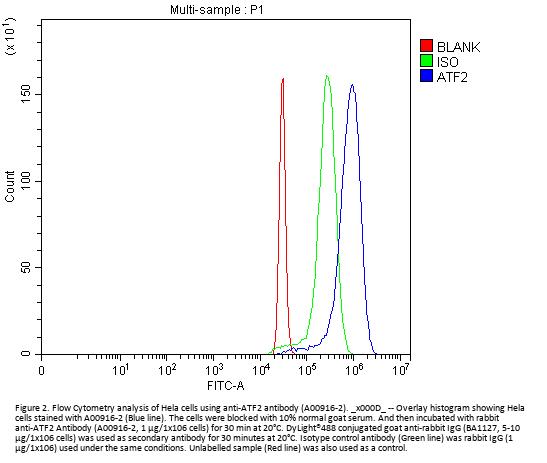Boster Bio Anti-ATF2 Antibody Picoband® catalog # A00916-2. Tested in ELISA, Flow Cytometry, WB applications. This antibody reacts with Human, Mouse, Rat. The brand Picoband indicates this is a premium antibody that guarantees superior quality, high affinity, and strong signals with minimal background in Western blot applications. Only our best-performing antibodies are designated as Picoband, ensuring unmatched performance.