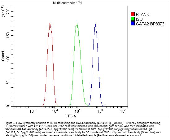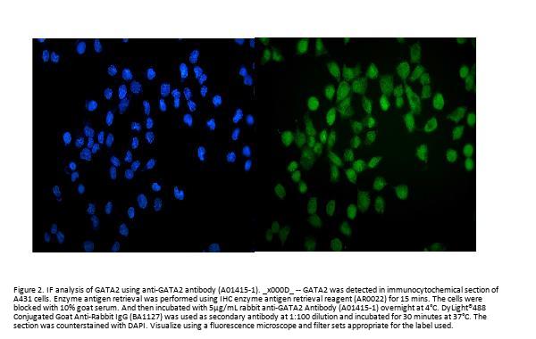 Boster Bio Anti-GATA2 Antibody Picoband® catalog # A01415-1. Tested in ELISA, Flow Cytometry, IF, ICC, WB applications. This antibody reacts with Human. The brand Picoband indicates this is a premium antibody that guarantees superior quality, high affinity, and strong signals with minimal background in Western blot applications. Only our best-performing antibodies are designated as Picoband, ensuring unmatched performance.