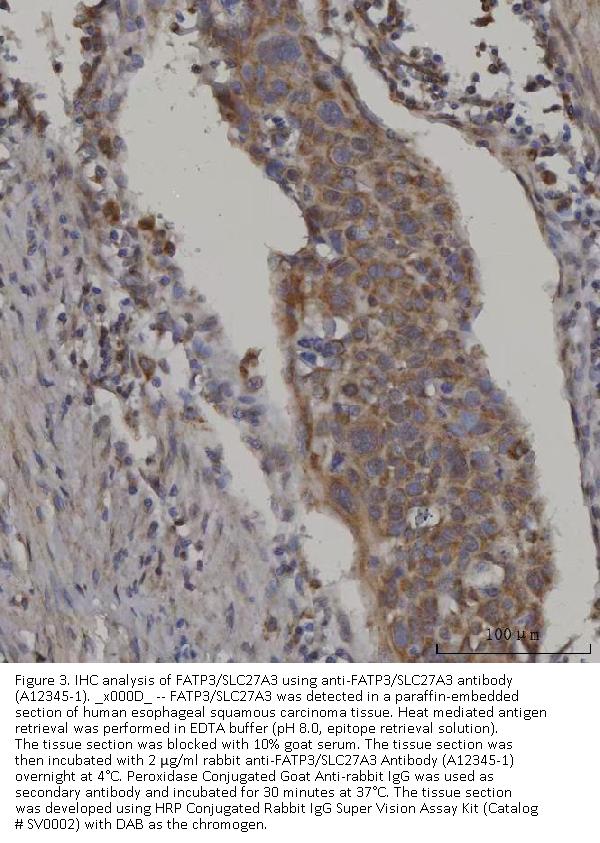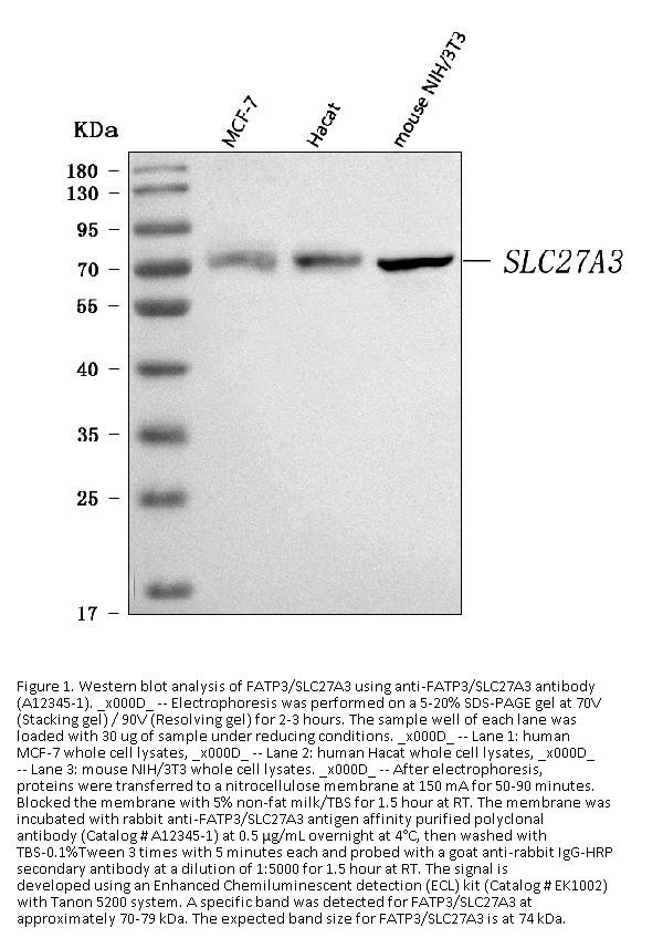 Boster Bio Anti-FATP3/SLC27A3 Antibody Picoband® catalog # A12345-1. Tested in ELISA, IHC, WB applications. This antibody reacts with Human, Mouse. The brand Picoband indicates this is a premium antibody that guarantees superior quality, high affinity, and strong signals with minimal background in Western blot applications. Only our best-performing antibodies are designated as Picoband, ensuring unmatched performance.