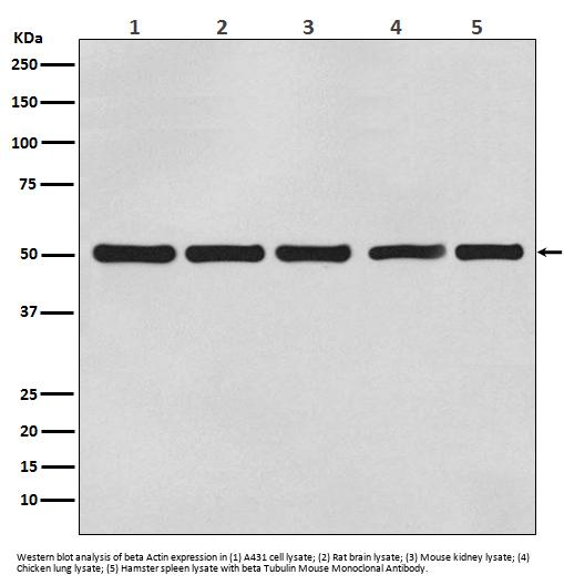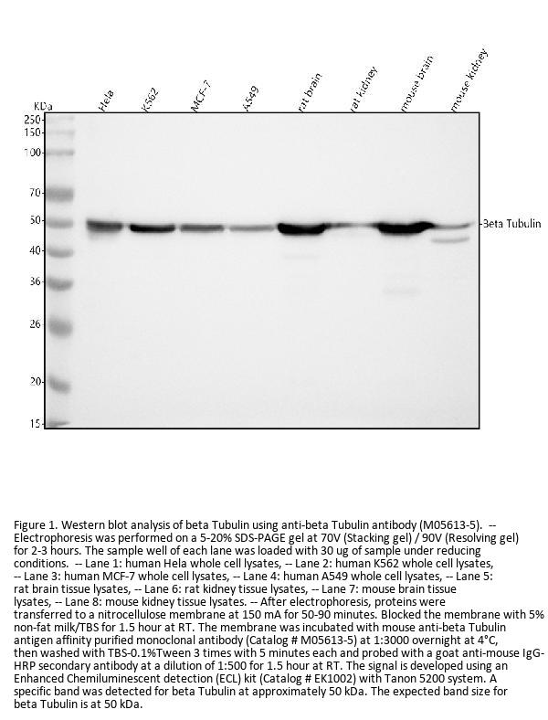 Boster Bio Anti-beta Tubulin Mouse Monoclonal Antibody catalog # M05613-5. Tested in WB, IHC, ICC/IF applications. This antibody reacts with Human, Mouse, Rat, Chicken, Hamster.