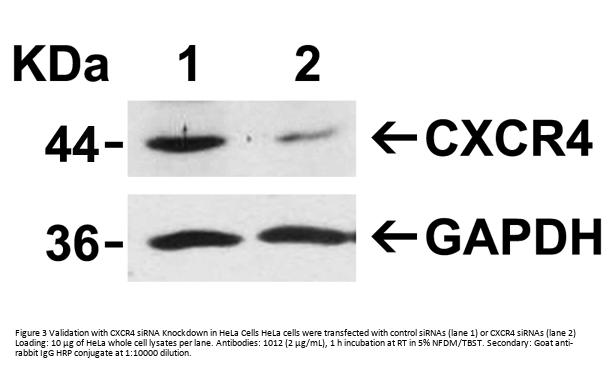 siRNA knockdown validation (Figure 3): Anti-CXCR4 antibody (1012) specificity was further verified by CXCR4 specific siRNA knockdown. CXCR4 signal in HeLa cells transfected with CXCR4 siRNAs was weaker in comparison with that in HeLa cells transfected with control siRNAs.