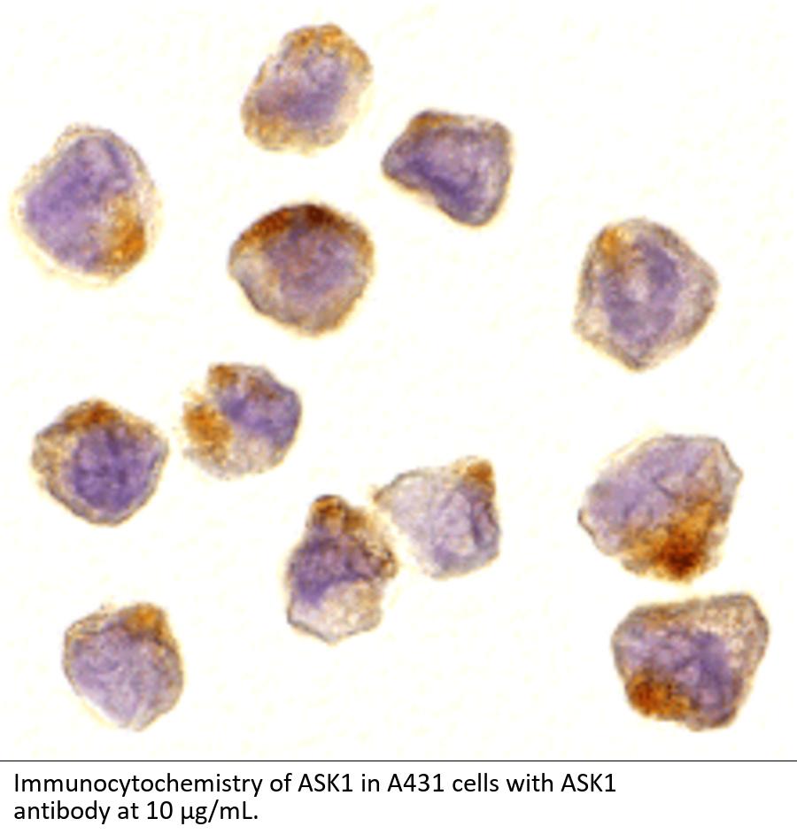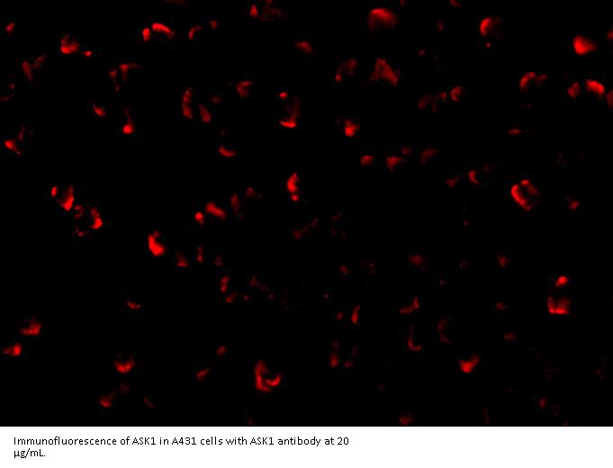 ASK1 antibody can be used for detection of ASK1 by Western blot at 0.5 μ g/mL. A 155 kDa band can be detected. Antibody can also be used for immunocytochemistry starting at 10 μ g/mL. For immunofluorescence start at 20 μ g/mL.