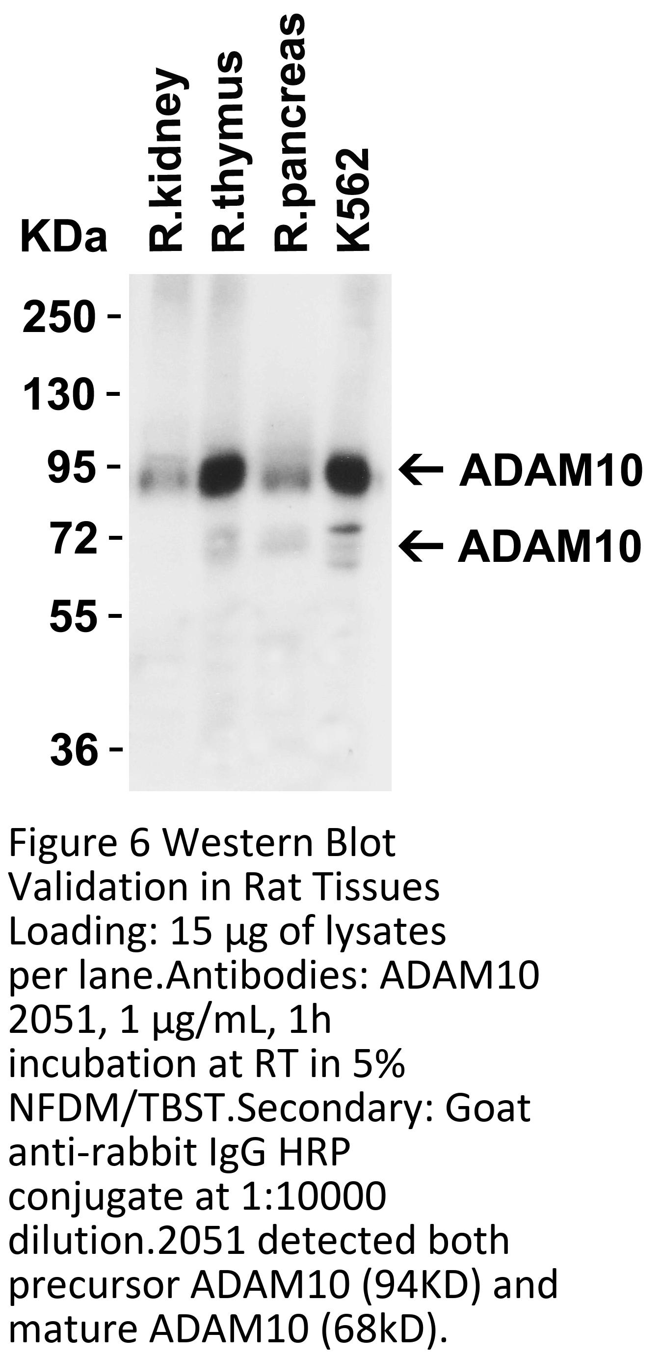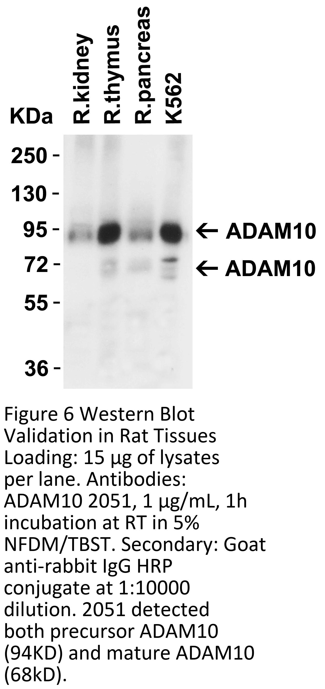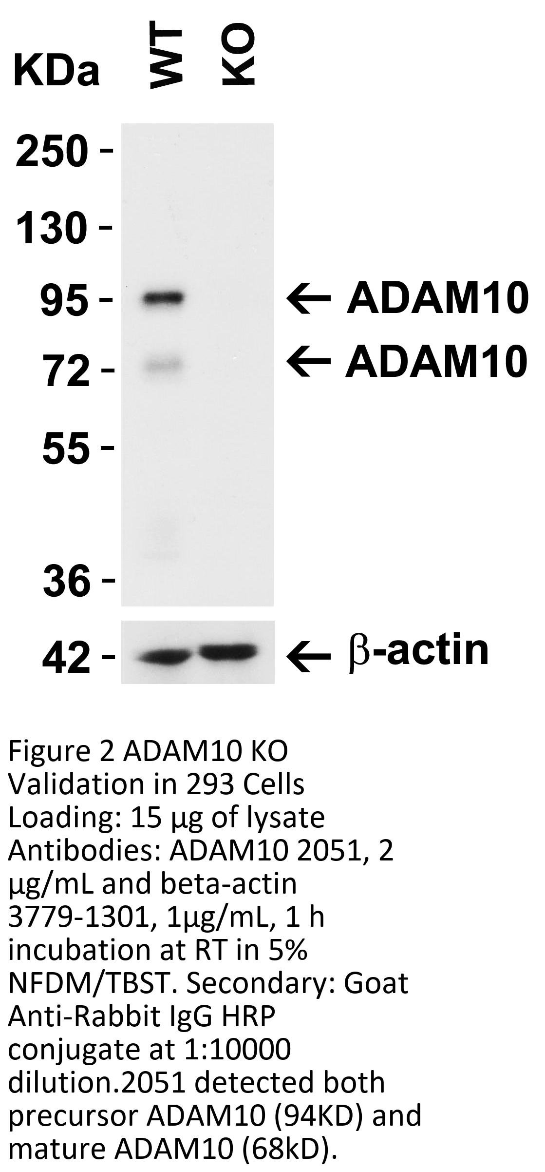 KO validation (Figure 1 and 2): Anti-ADAM10 antibody (2051) specificity was further verified by ADAM10 specific knockout. ADAM10 signal in was detected by 2051 in wild type of MEF cells and 293 cells, but not in ADAM10 knockout cells.