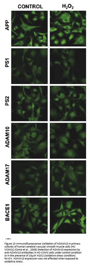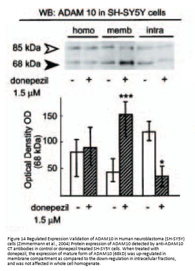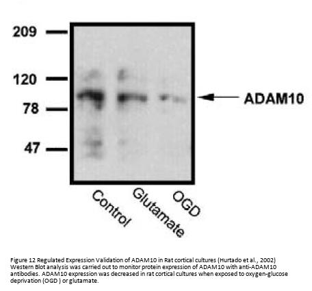 Regulated expression validation (Figure 12 and 14): ADAM10 expression detected by anit-ADAM10 antibodies (2051) was down-regulated when exposed to oxygen-glucose deprivation (OGD) or glutamate (Fig 8), and up-regulated in membrane compartment whereas down-regulated in intracellular fractions when treated with donepezil (Fig 14).
