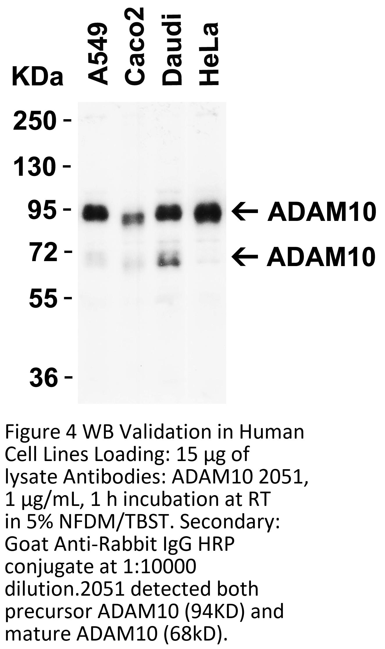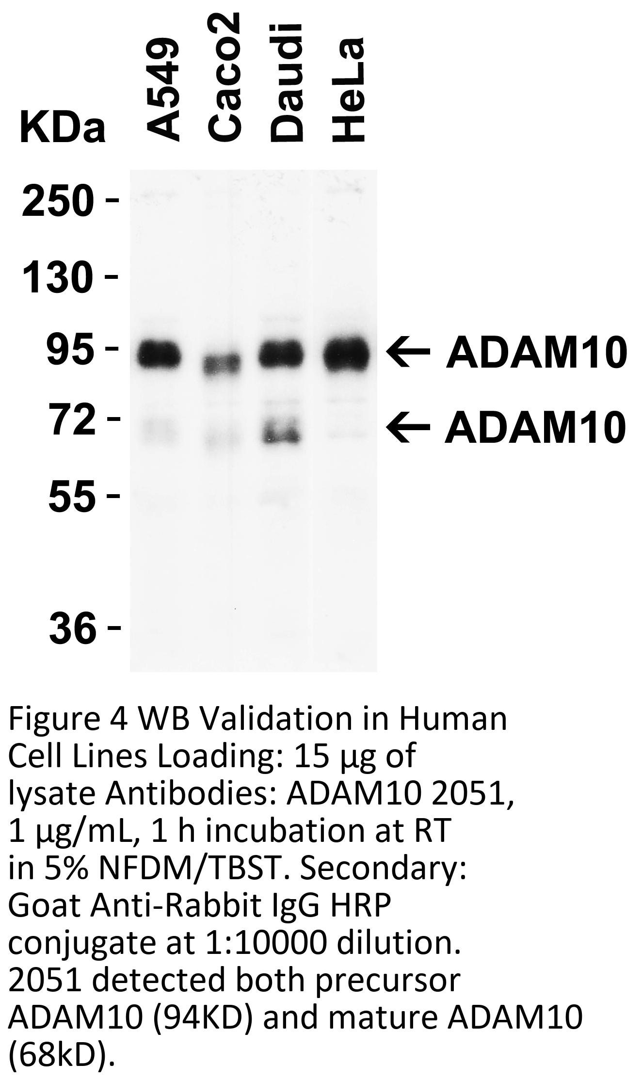 Independent Antibody Validation in Cell lines (Figure 3) shows similar ADAM10 expression profile in human and mouse cell lines detected by two independent anti-ADAM10 antibodies that recognize different epitopes, 2051 against C-terminus domain and 24-024 against human recombinant fusion protein. ADAM10 proteins are detected in the most tested cell lines at different expression levels by the two independent antibodies.