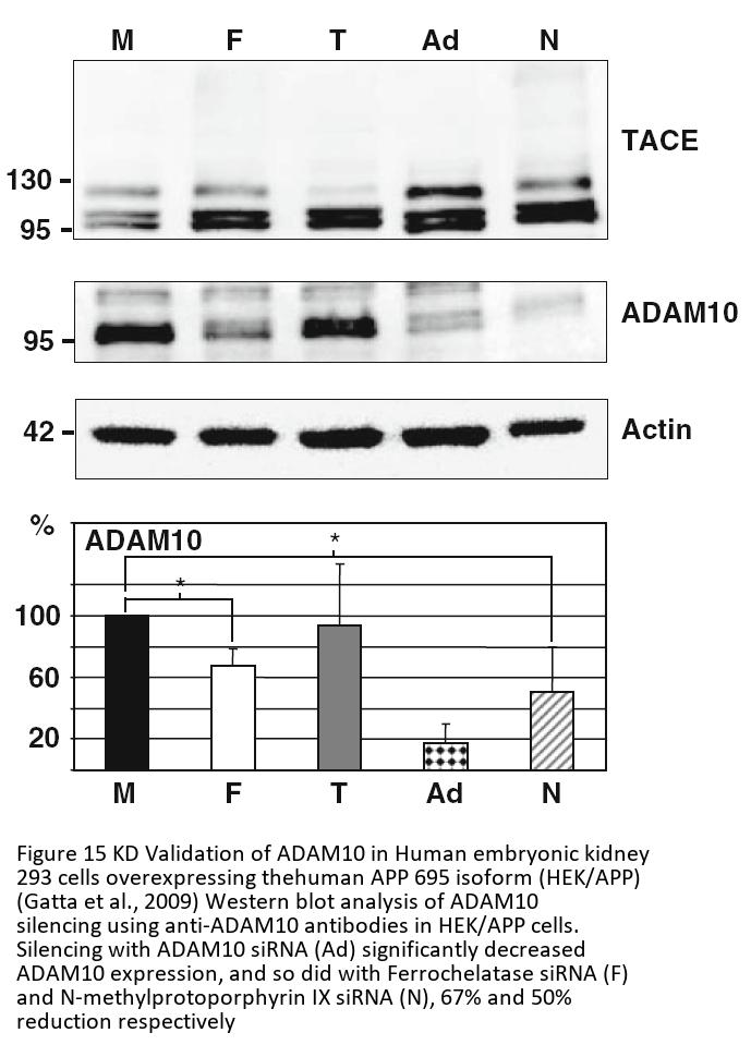 KD validation (Figure 15): Anti-ADAM10 antibody (2051) specificity was further verified by ADAM10 specific knockdown. ADAM10 signal in HEK/APP cells transfected with ADAM10 siRNA or Ferrochelatase siRNA (F) or N-methylprotoporphyrin IX siRNA (N) was disrupted in comparison with that in mock-transfected cells (M) or cells transfected with TACE siRNA (T).