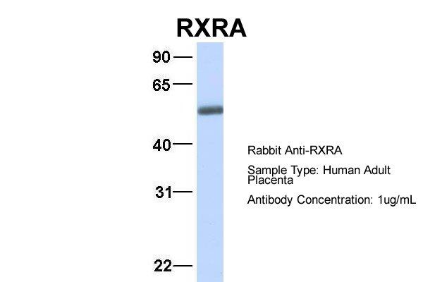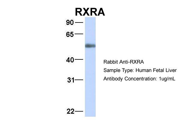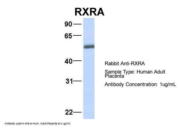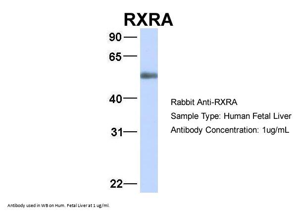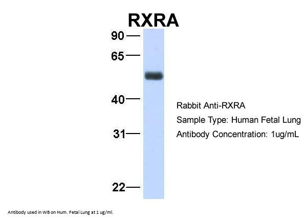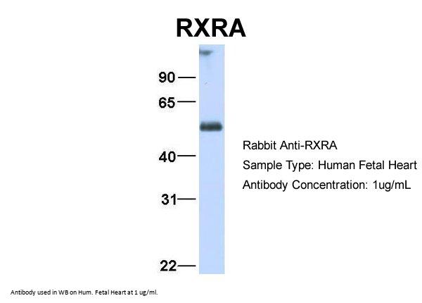 RXRA antibody can be used for detection of RXRA by ELISA at 1:312500. RXRA antibody can be used for detection of RXRA by western blot at 1 μ g/mL, and HRP conjugated secondary antibody should be diluted 1:50, 000 - 100, 000.