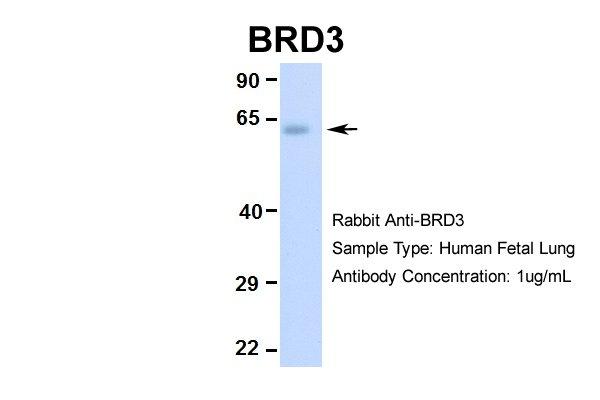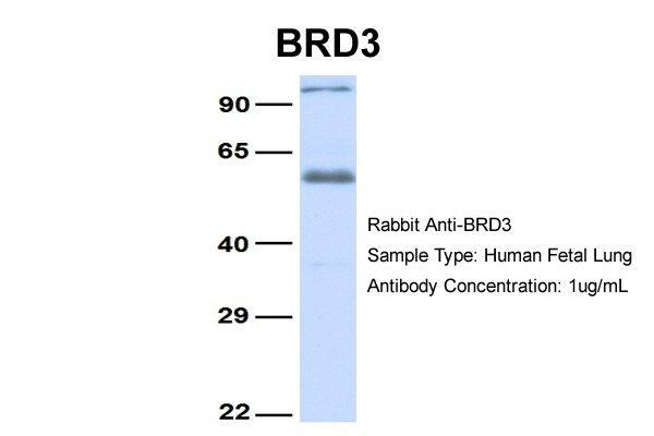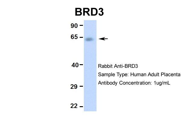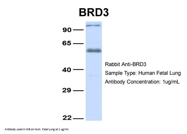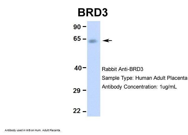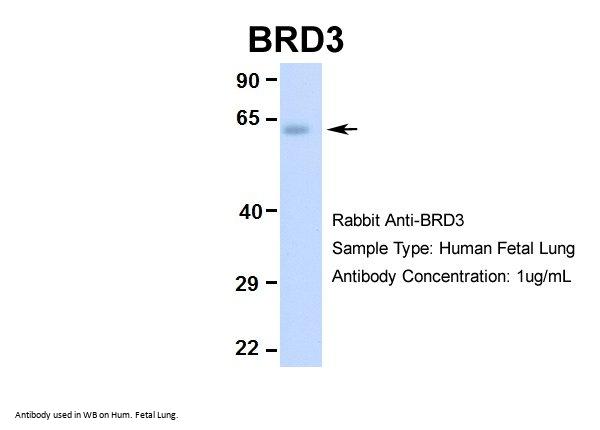 BRD3 antibody can be used for detection of BRD3 by ELISA at 1:62500. BRD3 antibody can be used for detection of BRD3 by western blot at 1 μ g/mL, and HRP conjugated secondary antibody should be diluted 1:50, 000 - 100, 000.