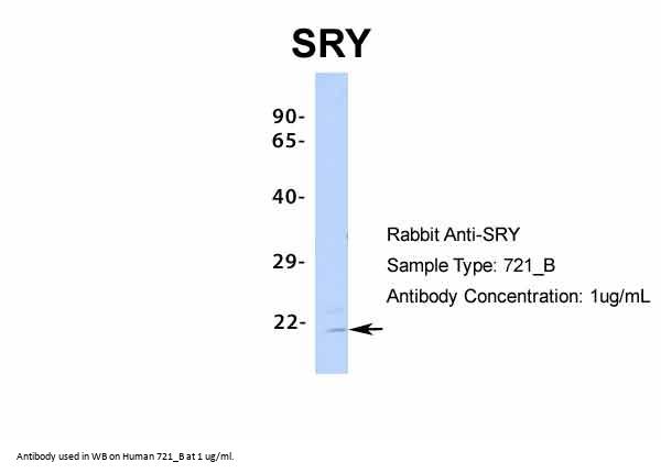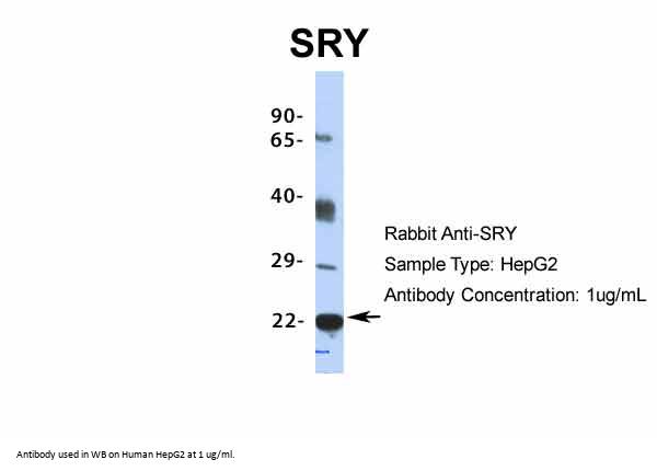 SRY antibody can be used for detection of SRY by ELISA at 1:62500. SRY antibody can be used for detection of SRY by western blot at 1 μ g/mL, and HRP conjugated secondary antibody should be diluted 1:50, 000 - 100, 000.