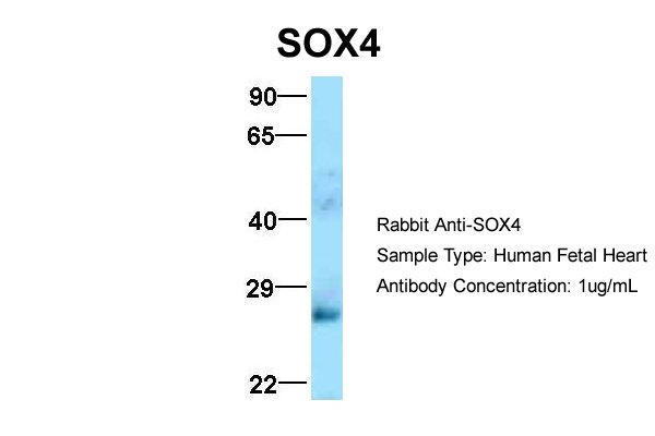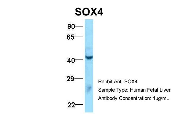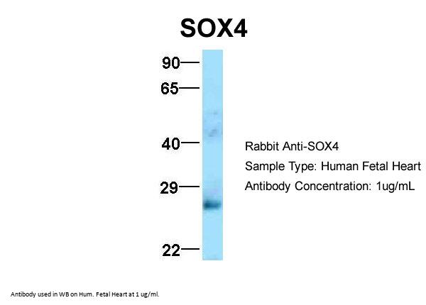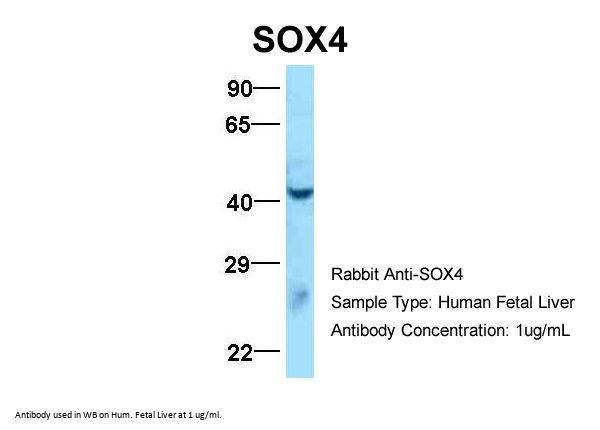 SOX4 antibody can be used for detection of SOX4 by ELISA at 1:1562500. SOX4 antibody can be used for detection of SOX4 by western blot at 1 μ g/mL, and HRP conjugated secondary antibody should be diluted 1:50, 000 - 100, 000.