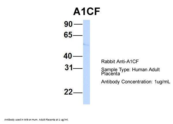 A1CF antibody can be used for detection of A1CF by ELISA at 1:1562500. A1CF antibody can be used for detection of A1CF by western blot at 1 μ g/mL, and HRP conjugated secondary antibody should be diluted 1:50, 000 - 100, 000.