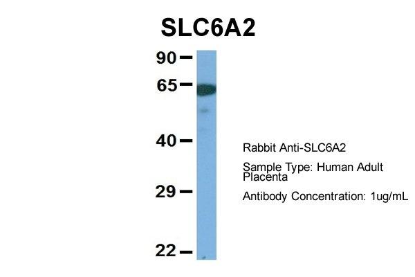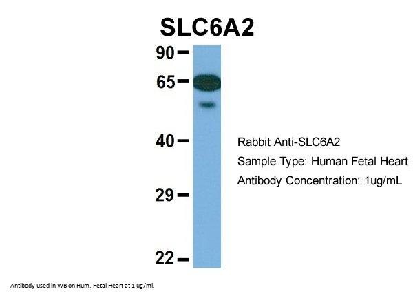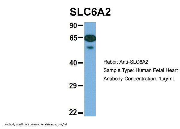 SLC6A2 antibody can be used for detection of SLC6A2 by ELISA at 1:312500. SLC6A2 antibody can be used for detection of SLC6A2 by western blot at 1 μ g/mL, and HRP conjugated secondary antibody should be diluted 1:50, 000 - 100, 000.