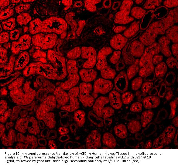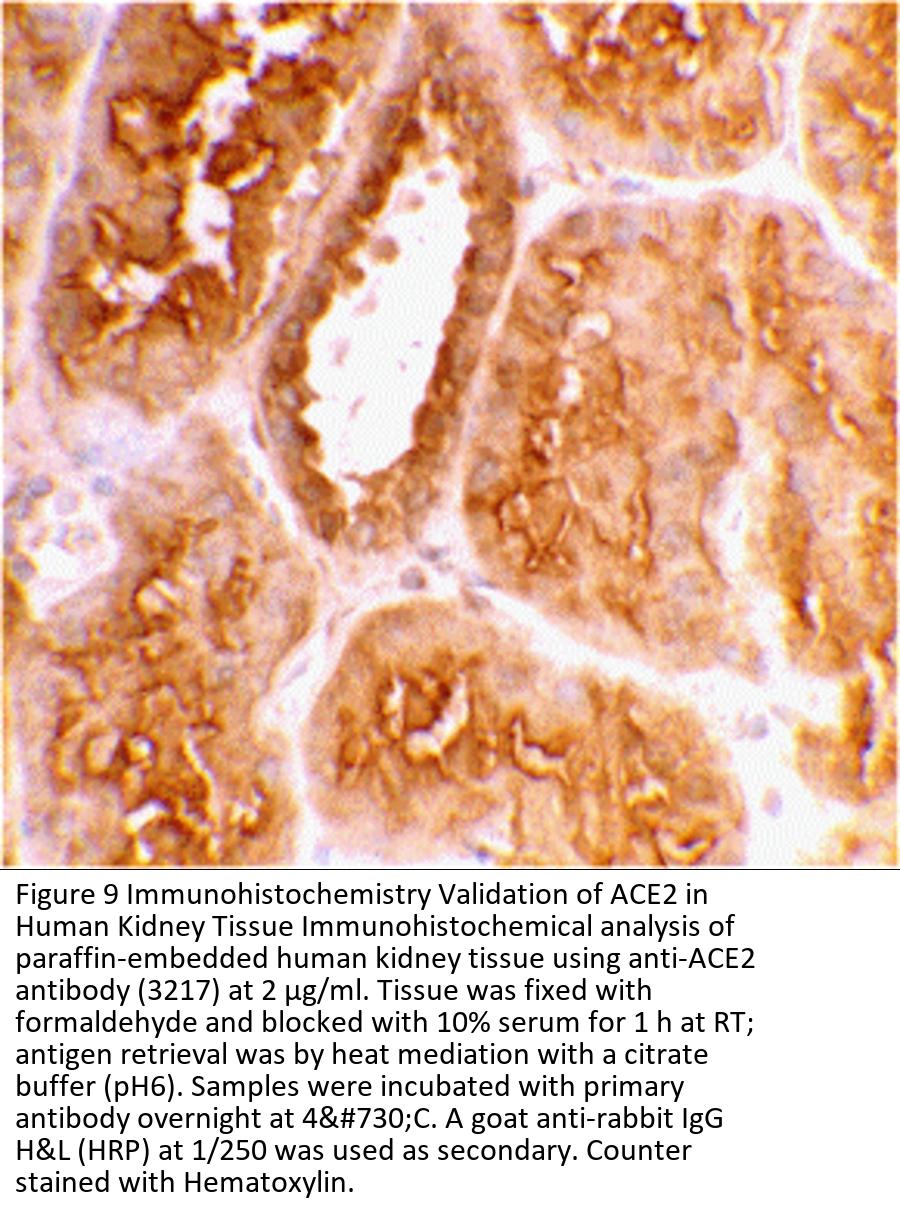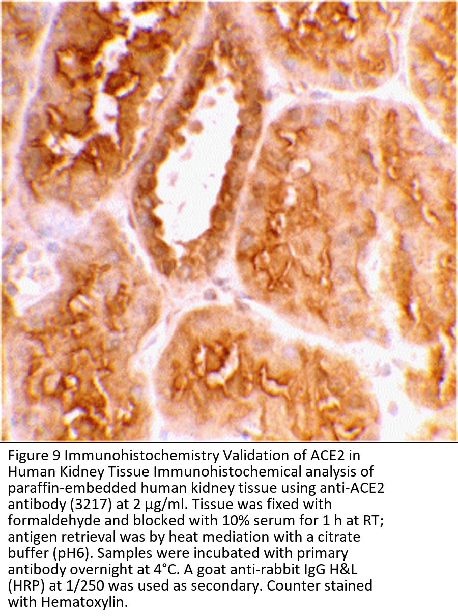 Independent Antibody Validation in Cell lines (Figure 1) shows similar ACE2 expression profile in human cell lines detected by three independent anti-ACE2 antibodies that recognize different epitopes, 3215 against central domain, 3217 against C-terminus domain and 3227 against N-terminus domain. ACE2 proteins are detected in the most tested tissues at different expression levels by three independent antibodies.