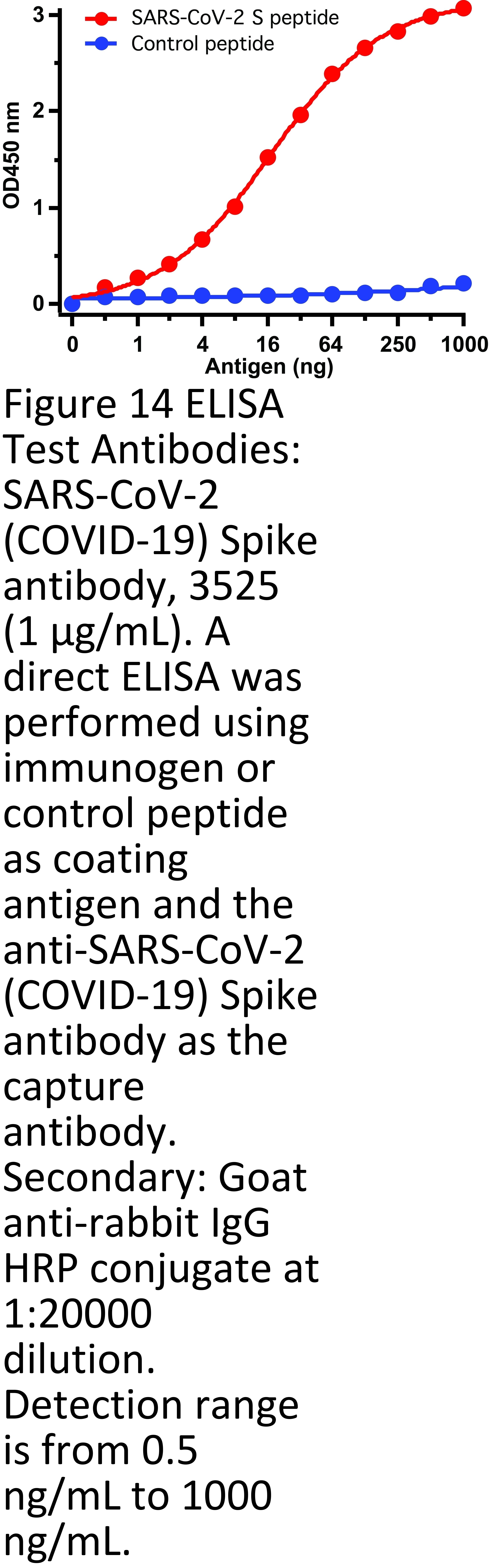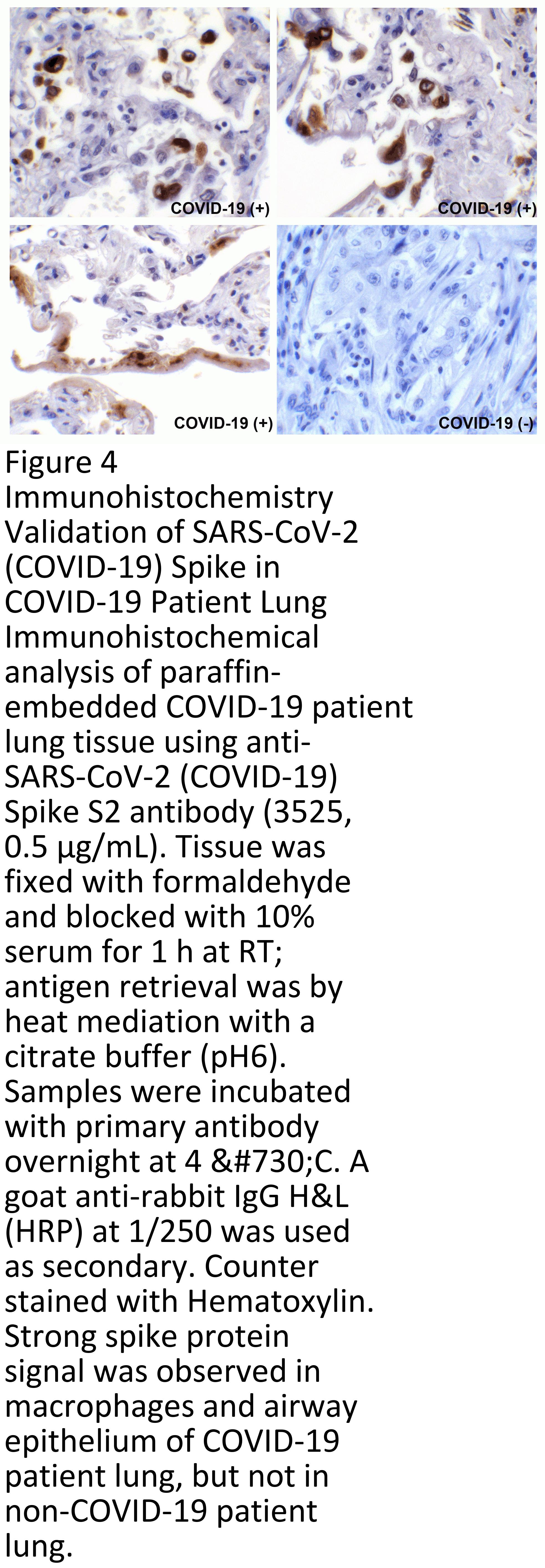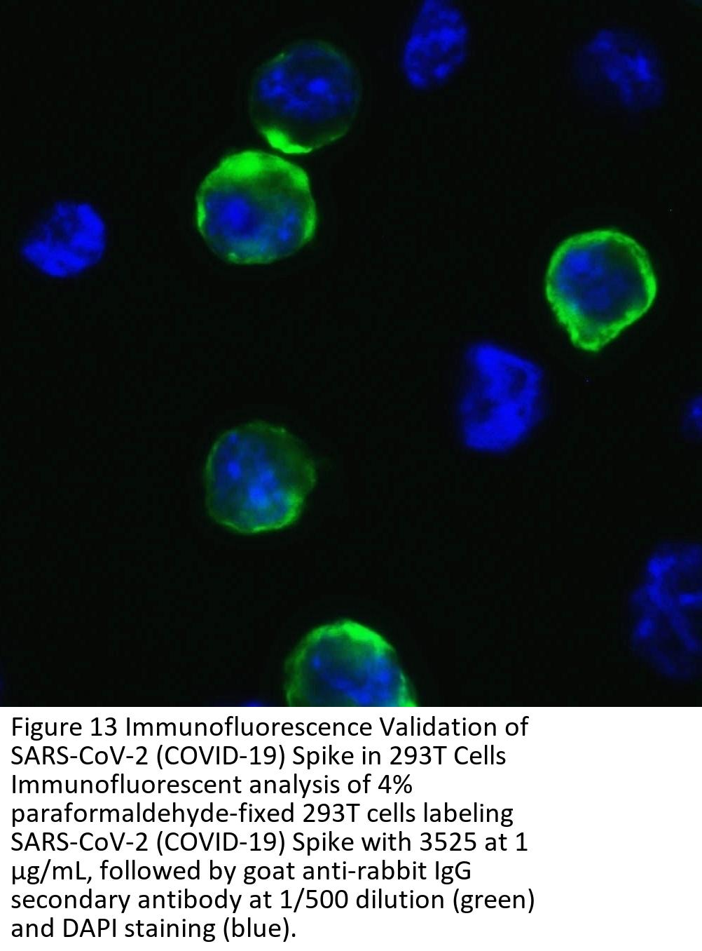 Antibody validated: Immunofluorescence and Western blot in human samples. Immunohisochemistry and immunofuorescence in COVID-19 patient samples. It will detect 4 ng of free peptide at 1 μ g/mL. The immunogen for this is within the last 50 aa of the spike protein - a peptide corresponding to 20 amino acids near the carboxy terminus of SARS-CoV-2 (COVID-19) Spike glycoprotein.