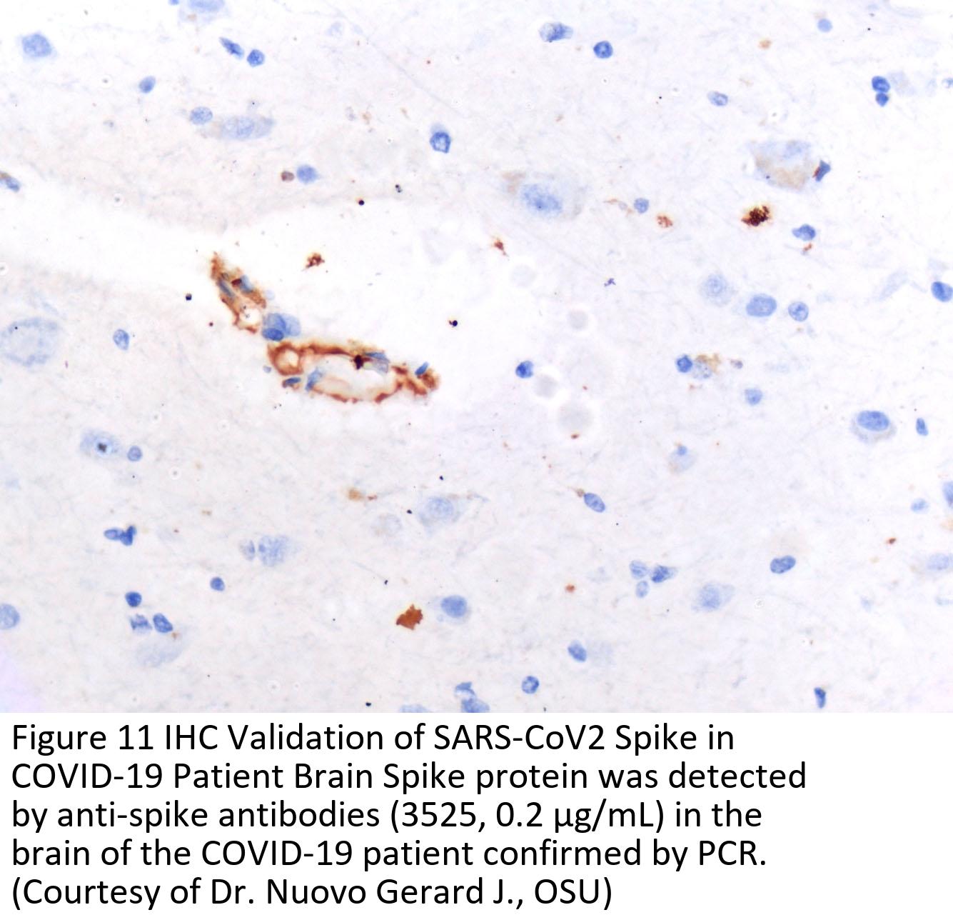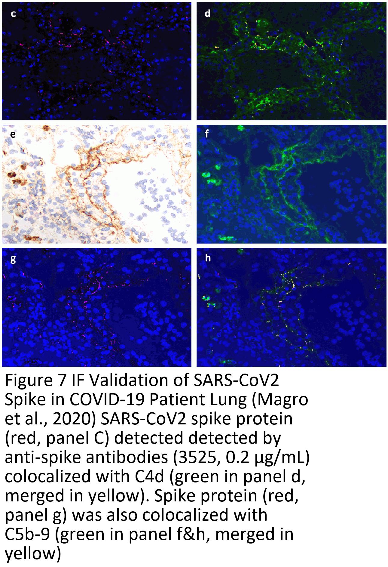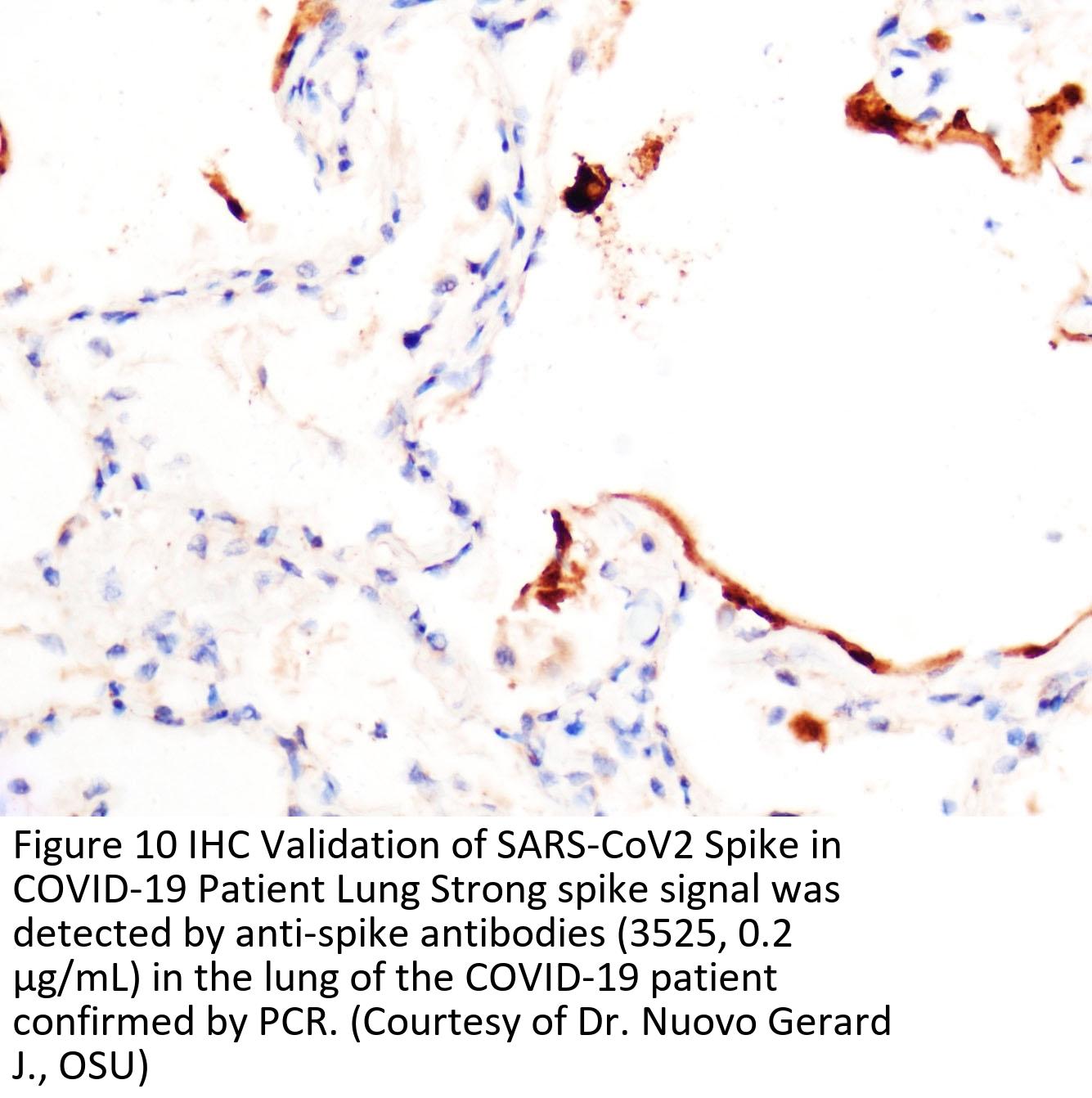 Antibody validated: Immunofluorescence and Western blot in human samples. Immunohisochemistry and immunofuorescence in COVID-19 patient samples. It will detect 4 ng of free peptide at 1 μ g/mL. The immunogen for this is within the last 50 aa of the spike protein - a peptide corresponding to 20 amino acids near the carboxy terminus of SARS-CoV-2 (COVID-19) Spike glycoprotein.