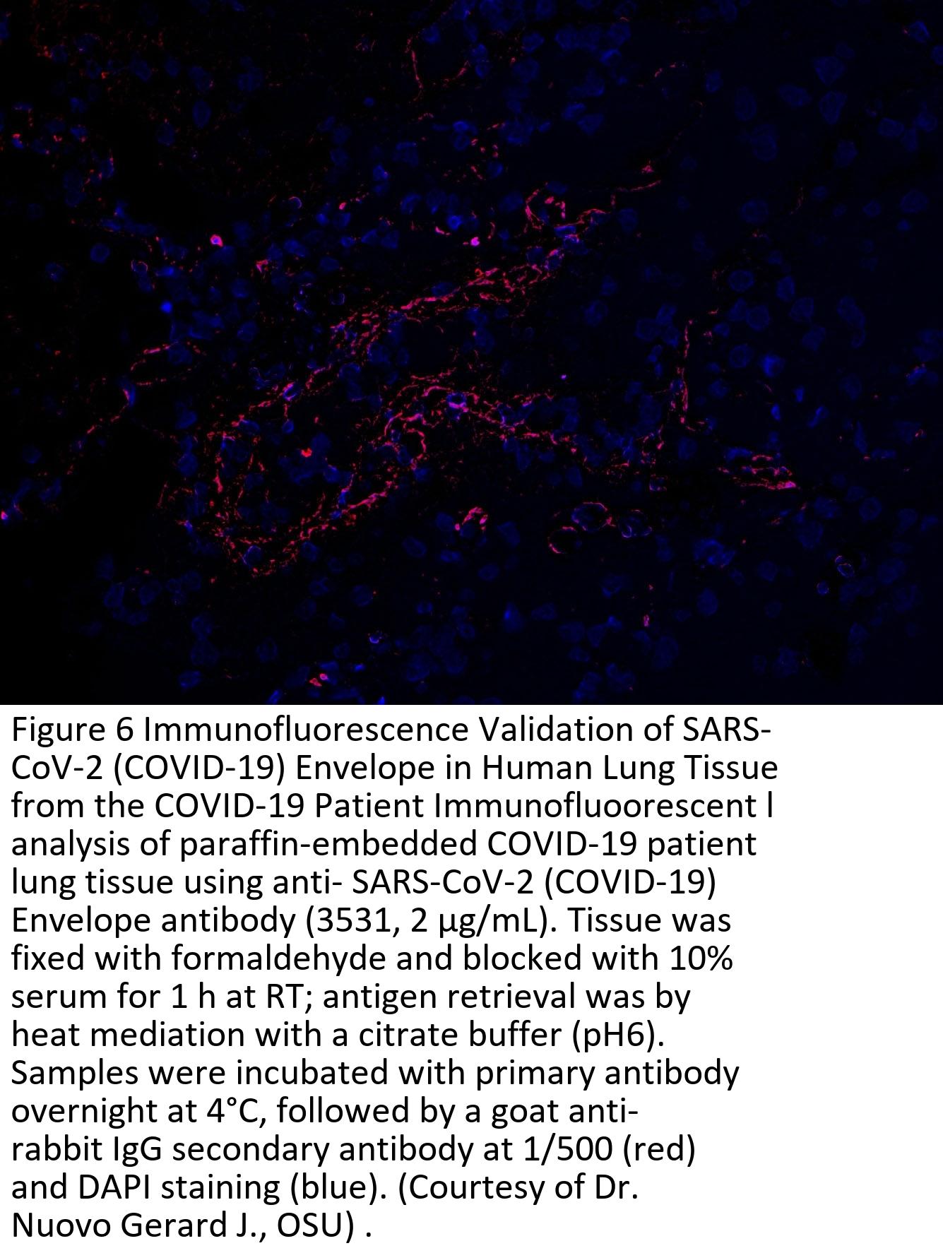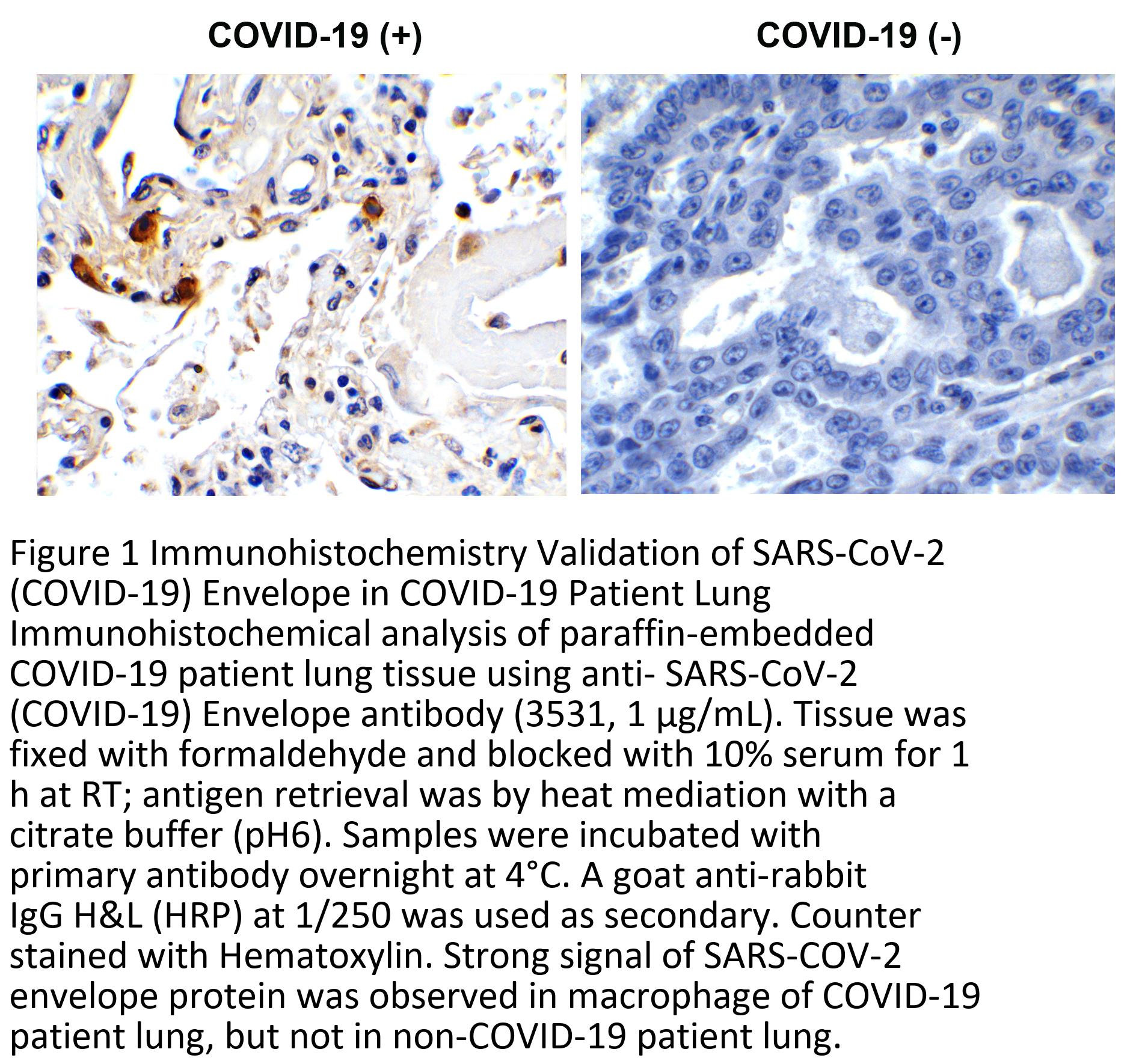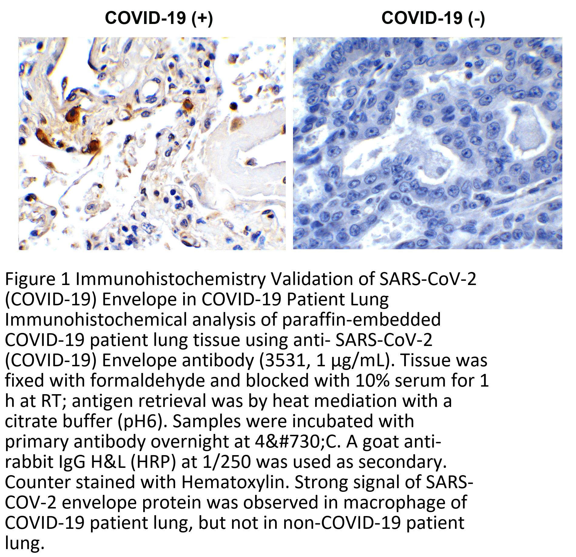 Antibody validated: Immunohisochemistry and immunofuorescence in COVID-19 patient samples. SARS-CoV-2 (COVID-19, 2019-nCoV) Envelope antibody can detect 50 ng of free peptide at 1 μ g/mL in ELISA. But it cannot detect envelope recombinant protein in WB and ELISA.