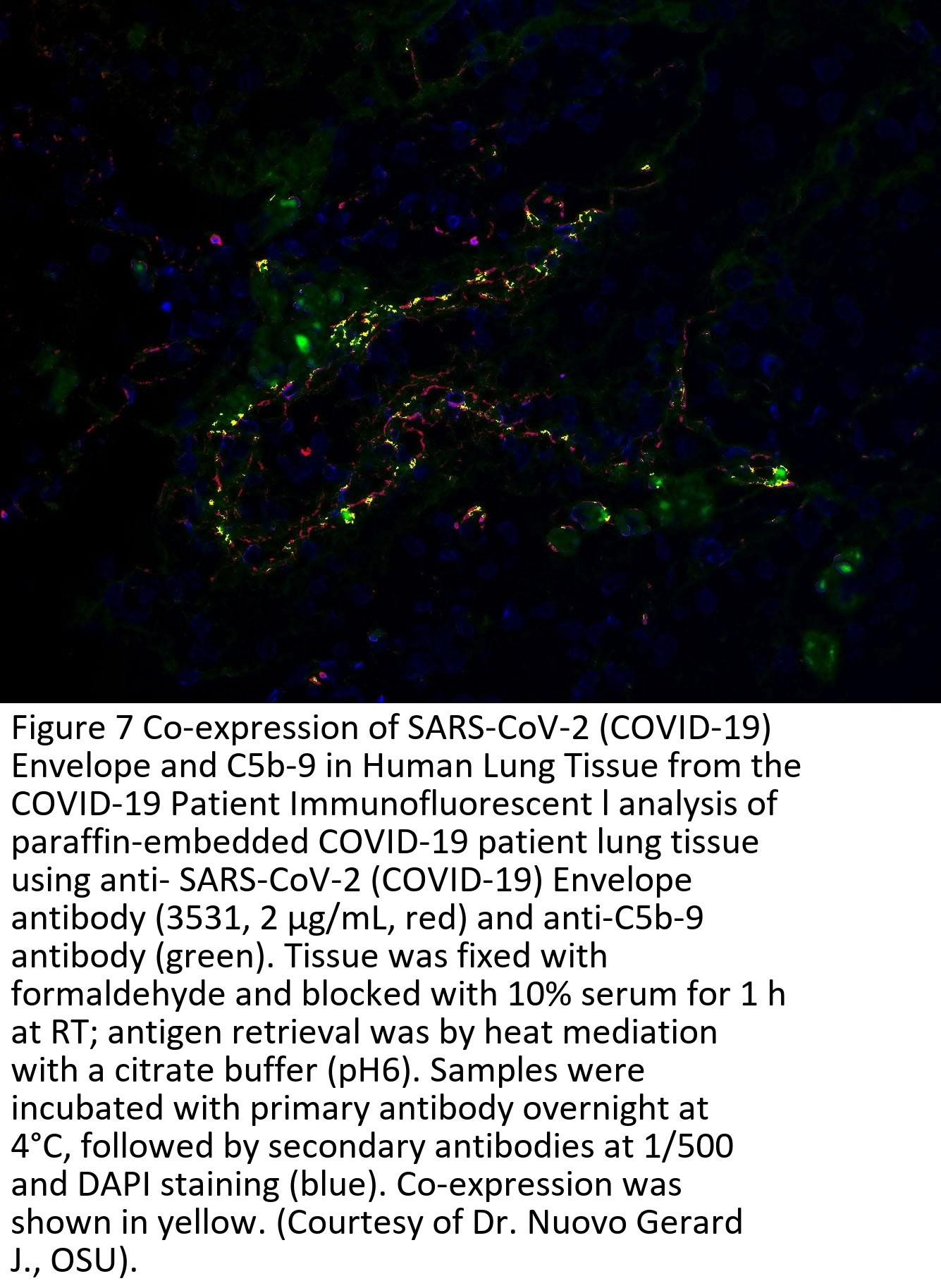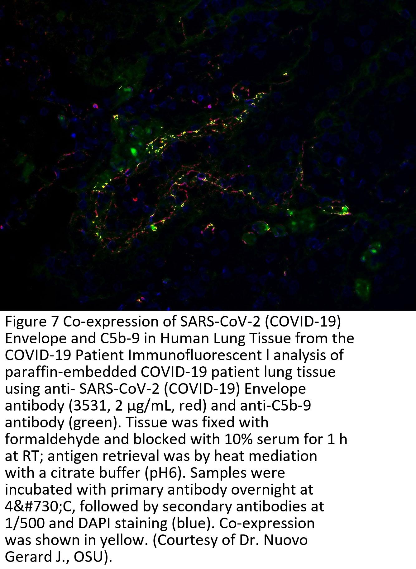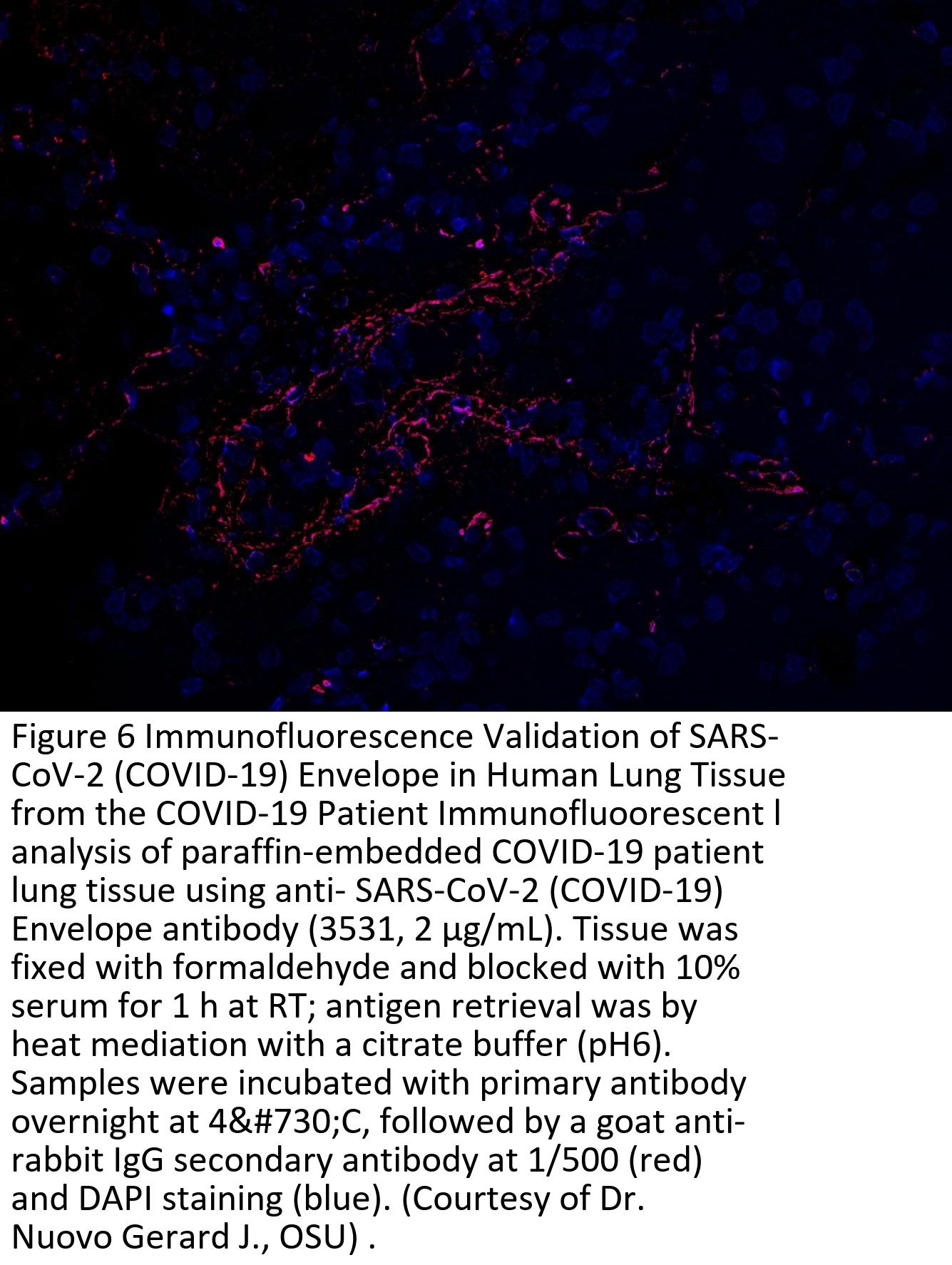 Antibody validated: Immunohisochemistry and immunofuorescence in COVID-19 patient samples. SARS-CoV-2 (COVID-19, 2019-nCoV) Envelope antibody can detect 50 ng of free peptide at 1 μ g/mL in ELISA. But it cannot detect envelope recombinant protein in WB and ELISA.