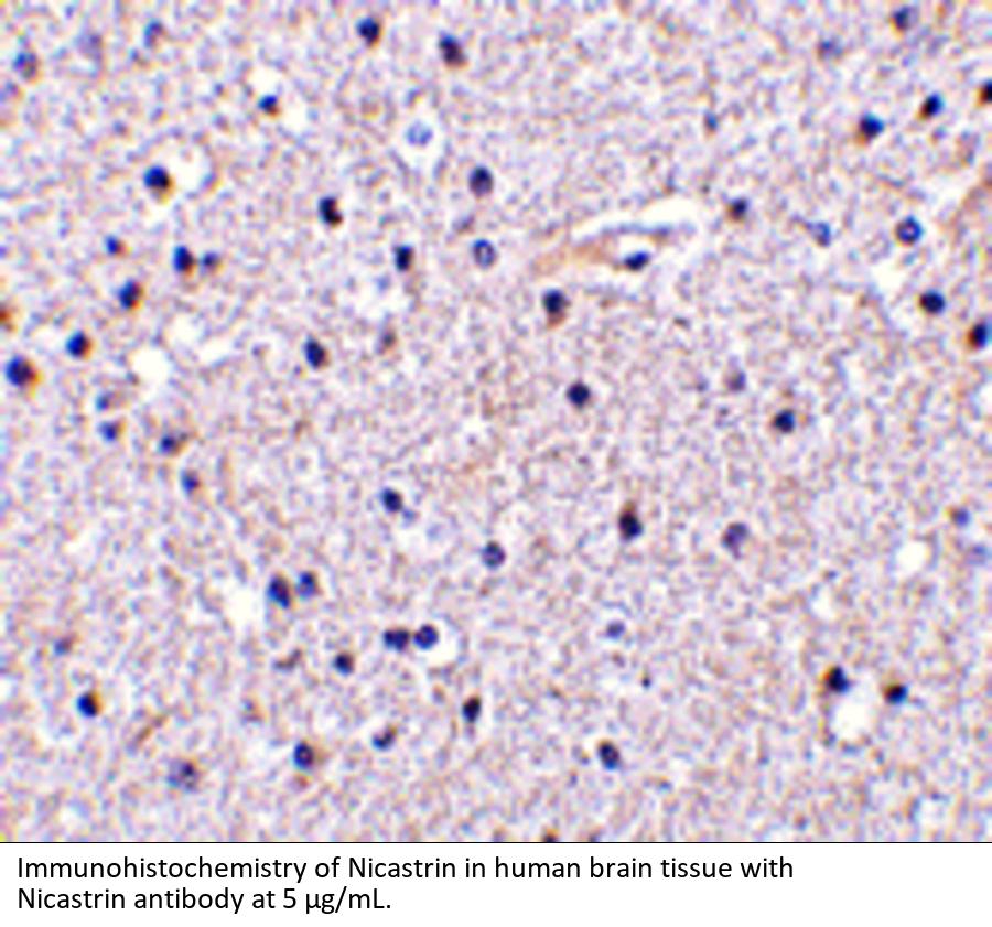 Nicastrin Antibody: Nicastrin, in addition to presenilin, PEN2, and APH-1 forms the gamma-secretase protein complex, a membrane-bound aspartyl protease that can cleave certain proteins at peptide bonds buried within the hydrophobic environment of the lipid bilayer. This cleavage is responsible for a key step in signaling from several cell-surface receptors and is thought to be required for the generation of the neurotoxic amyloid peptides that are central to the pathogenesis of Alzheimer's disease. Like the tumor necrosis factor-a-converting enzyme (TACE) and the b-site cleavage enzyme (BACE) protease families, gamma-secretase will cleave the amyloid precursor protein (APP), but within the intramembrane region of APP, resulting in either the non-toxic p3 (from the alpha and gamma cleavage site) or the toxic Abeta amyloid peptide (from the beta and gamma cleavage site). It is thought that accumulation of the Abeta peptide is the precursor to Alzheimer's disease. Nicastrin is also thought to be involved in cell proliferation and signaling, especially in regards to activation of Notch receptors as loss of Nicastrin expression results in mouse embryonic lethality.