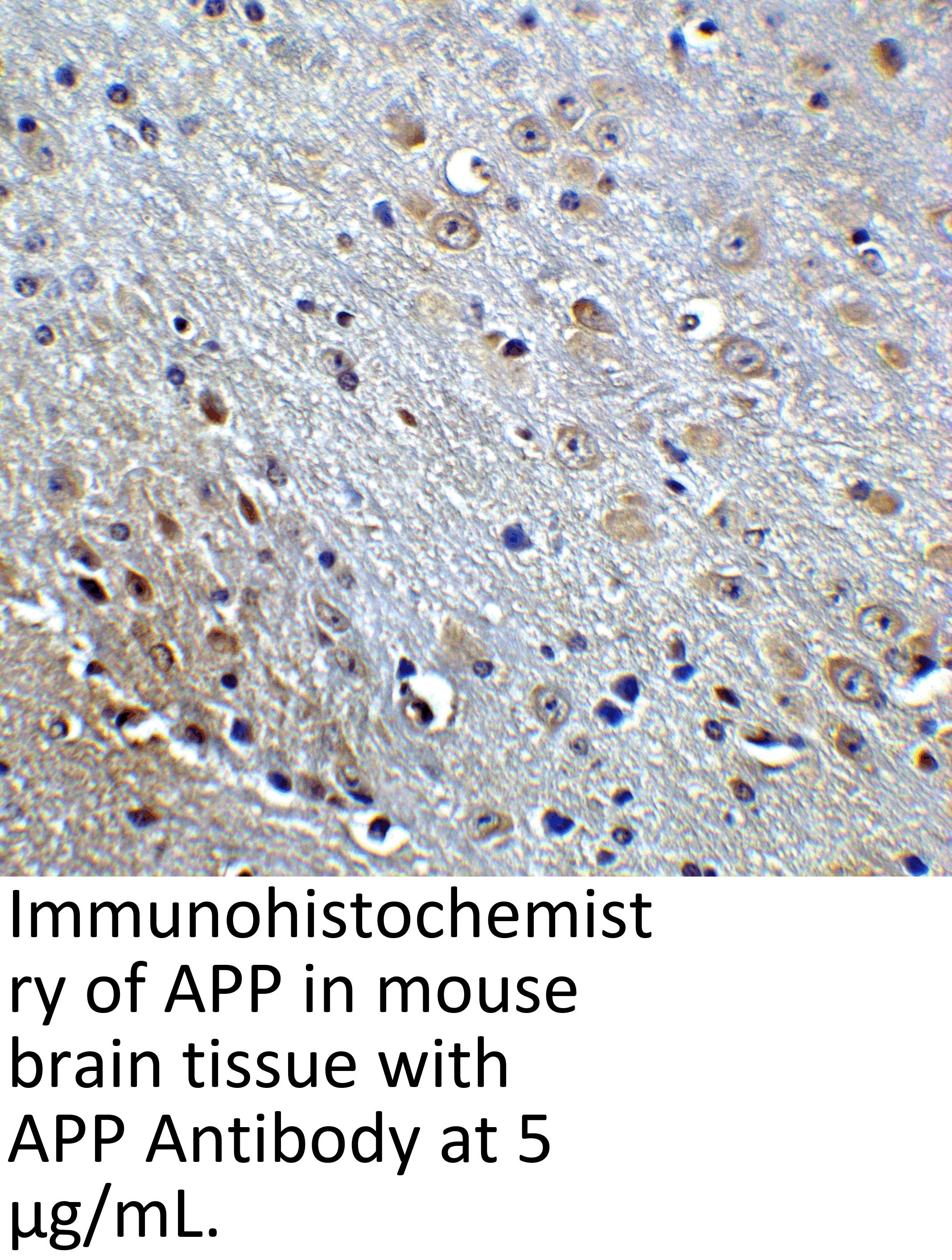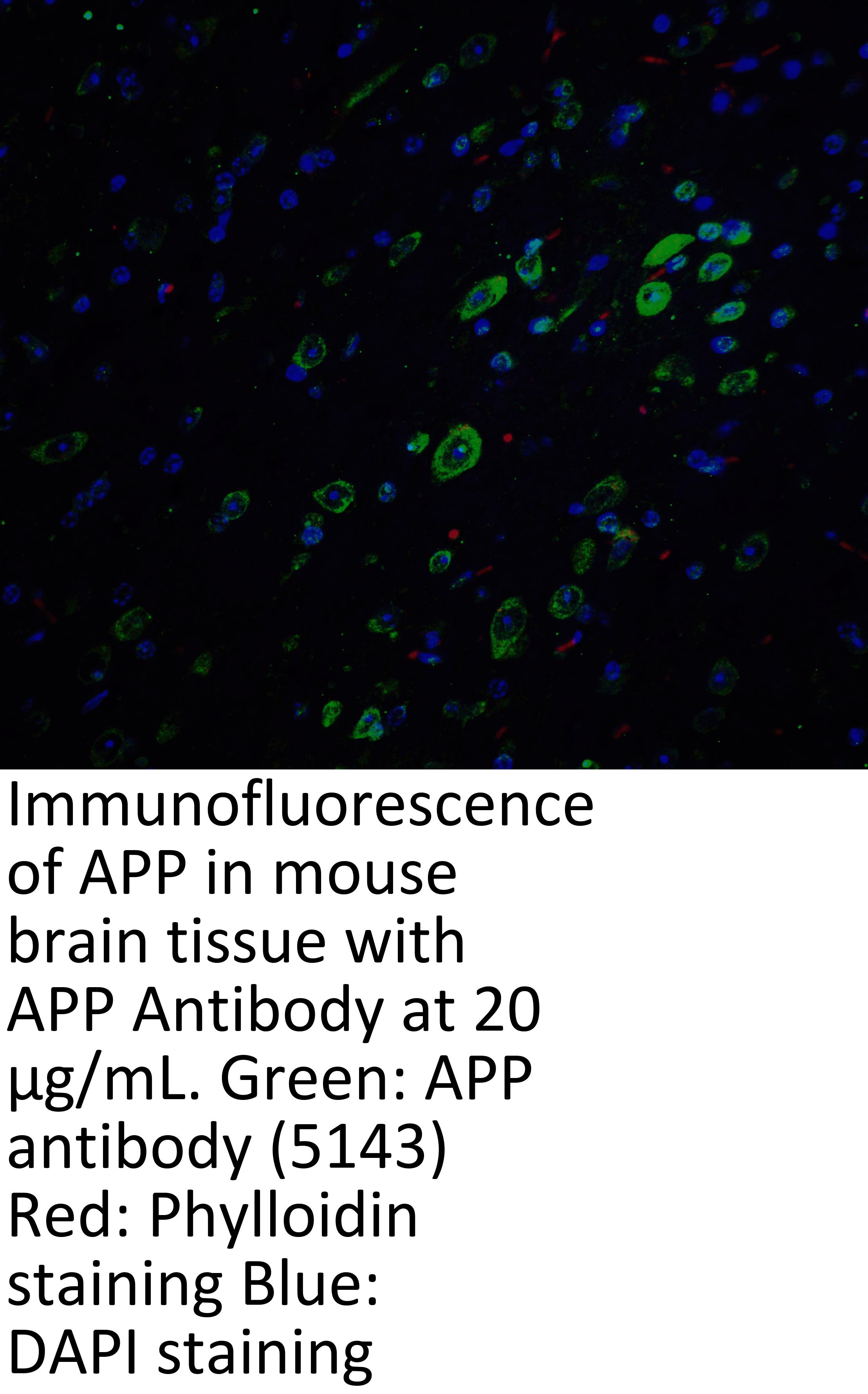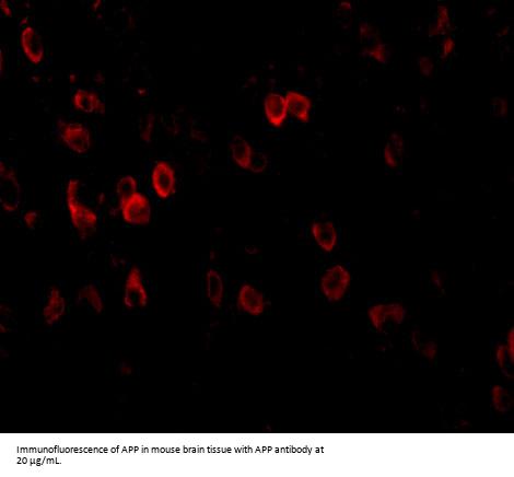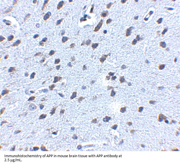 APP antibody can be used for detection of APP by Western blot at 1 - 2 μ g/mL. Antibody can also be used for immunohistochemistry starting at 2.5 μ g/mL. For immunofluorescence start at 20 μ g/mL.