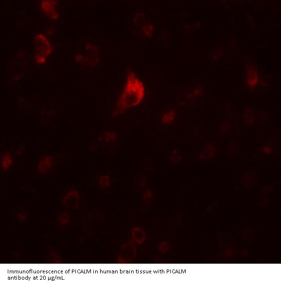 PICALM Antibody: PICALM, also known as the clathrin assembly lymphoid myeloid leukemia (CALM) protein, co-localizes with clathrin at clathrin-coated areas of the plasma membrane and in the Golgi area, and is thought to be an important component of the coated pit internalization machinery. Fusion proteins involving PICALM have been implicated in acute myeloid and T-cell acute lymphoblastic leukemia. PICALM is also expressed in neurons and is present at the synapse where it facilitates the endocytosis of the synaptic vesicle protein VAMP2. Recent studies have identified variants of PICALM associated with Alzheimer's disease and have suggested this protein may play a role in the endocytosis and recycling of the amyloid protein precursor (APP).