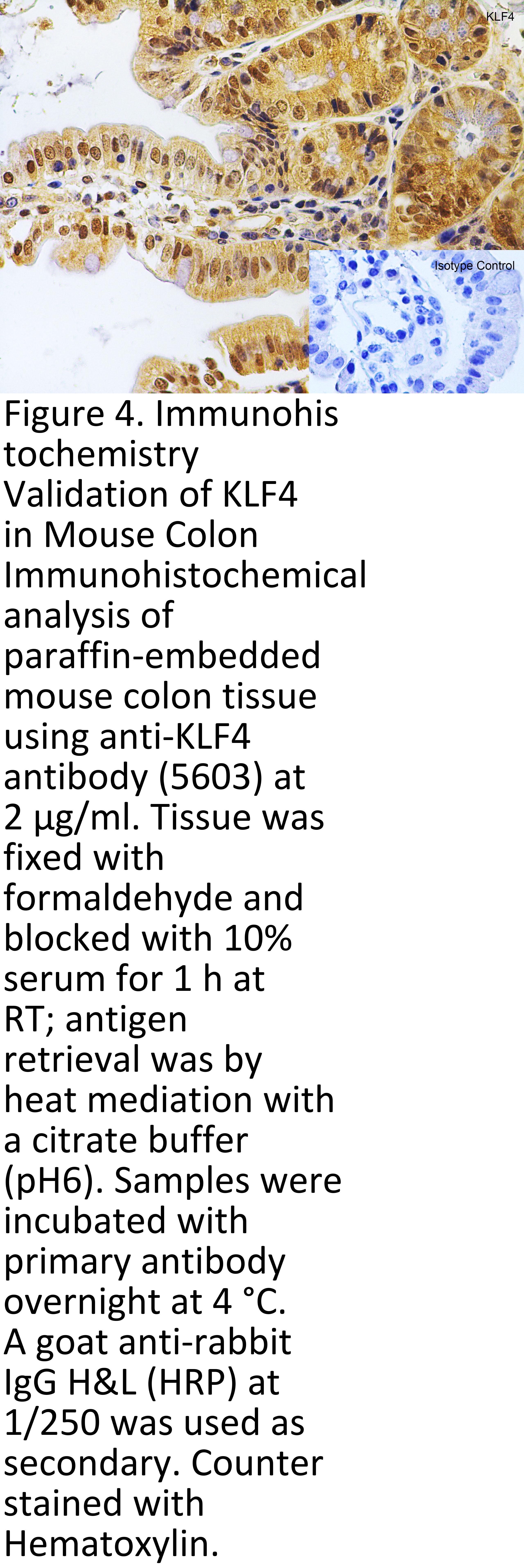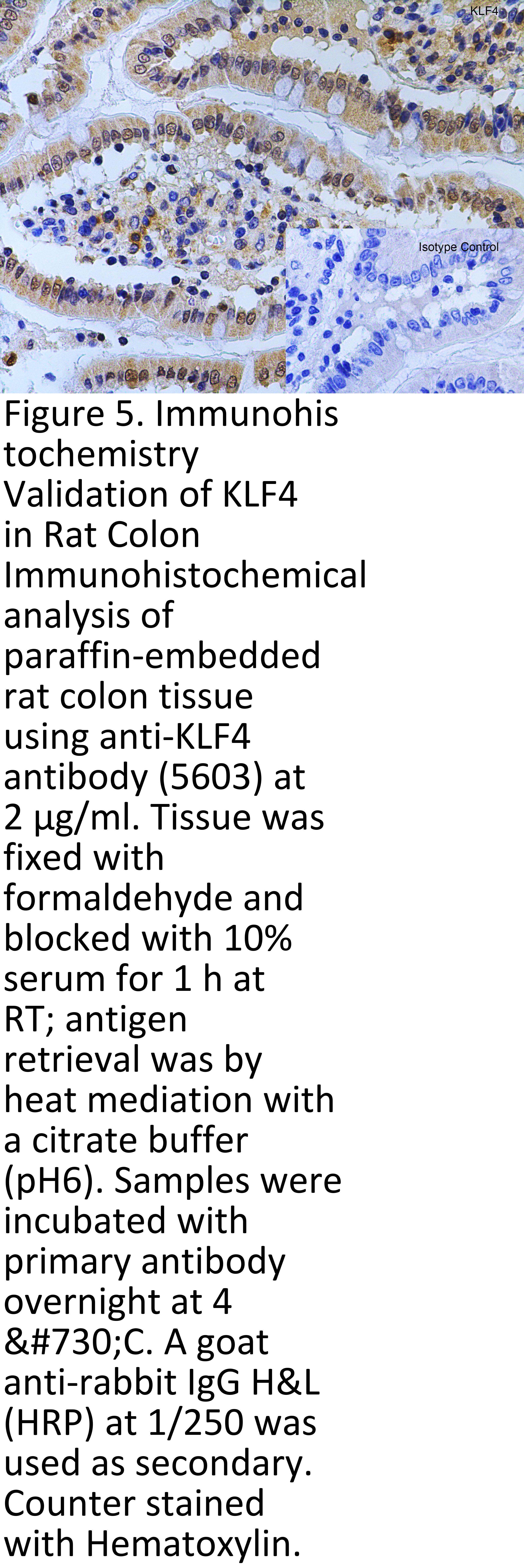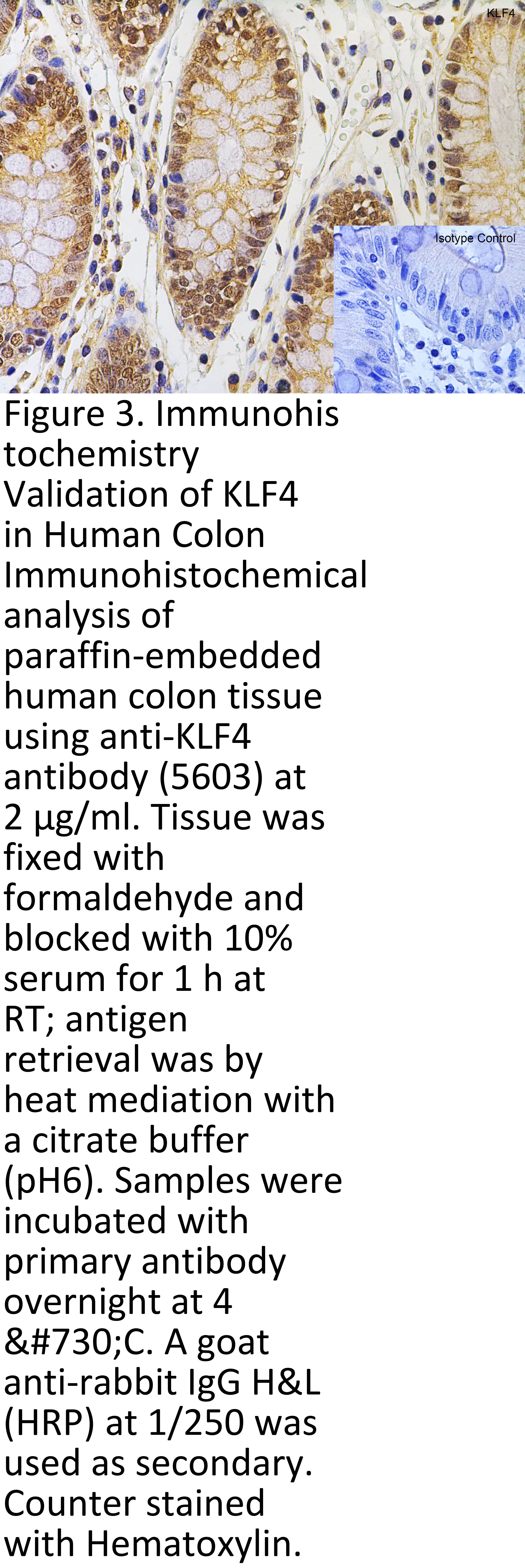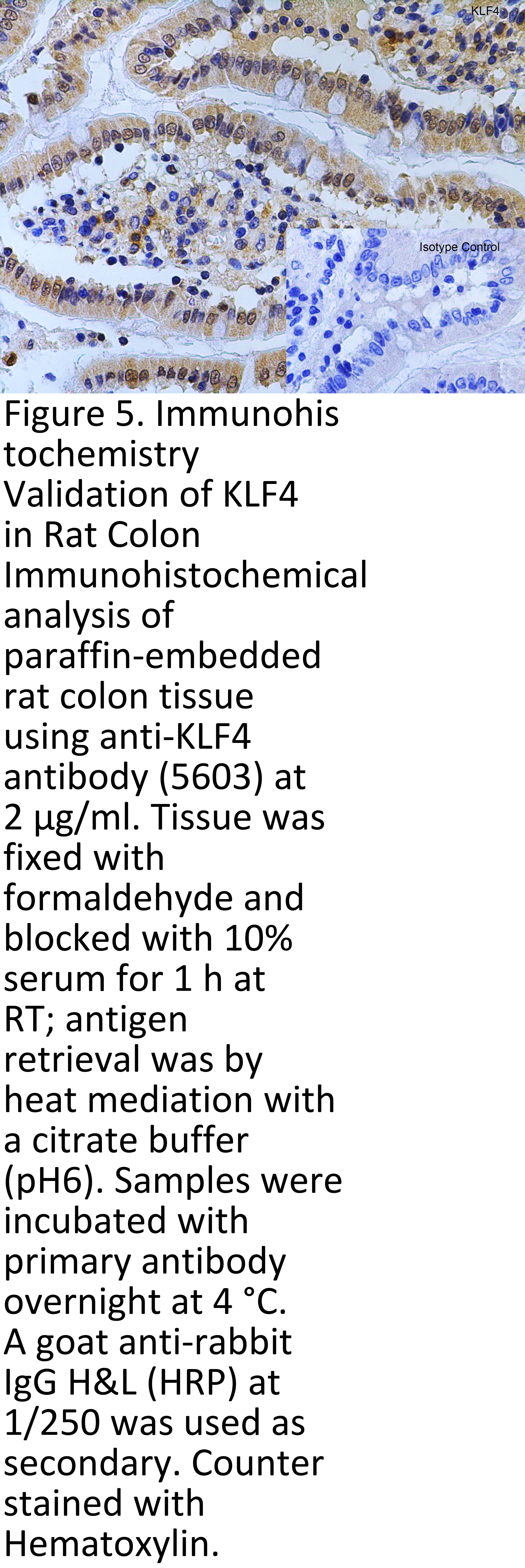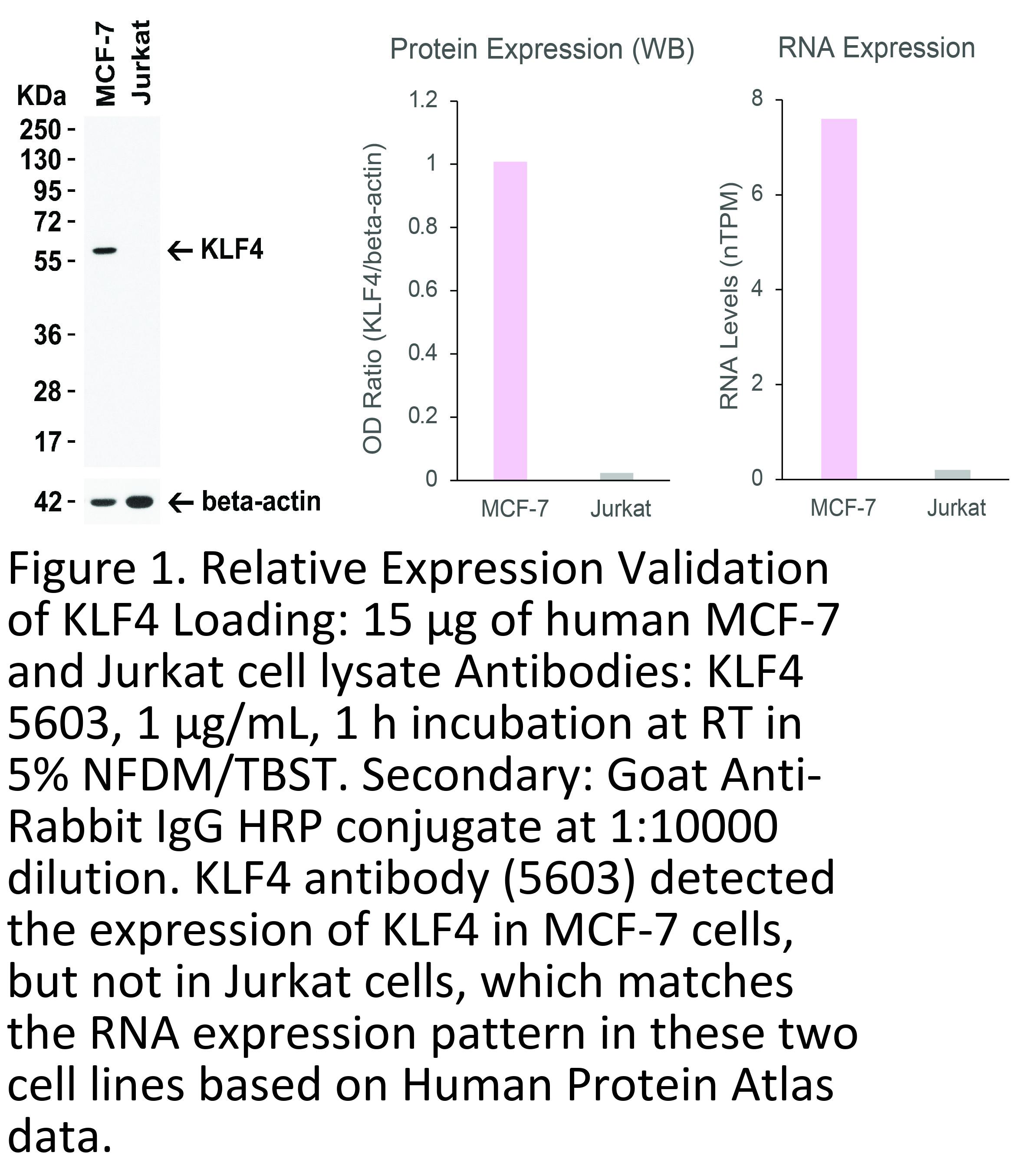 Relative Expression Validation (Figure 1): Anti-KLF4 antibodies (5603) specificity was further verified by KLF4 relative expression. KLF4 protein was detected in MCF-7 cells, but not in Jurkat cells, which matches the RNA expression pattern in these two cell lines based on Human Protein Atlas data (https://www.proteinatlas.org/ENSG00000136826-KLF4/subcellular ).