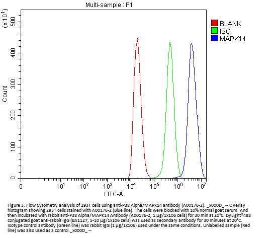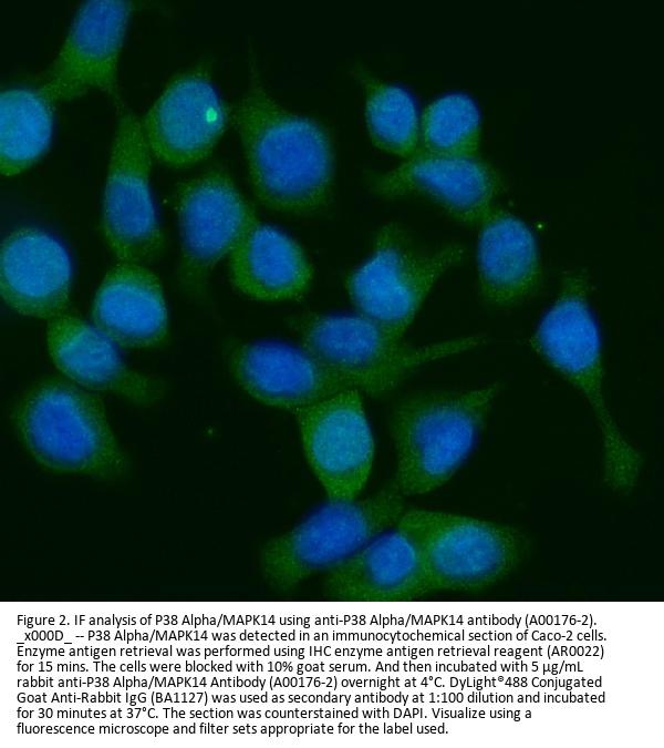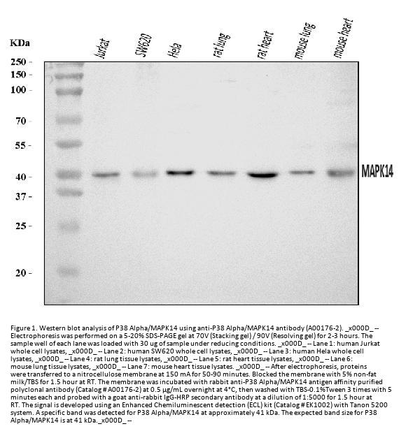 Boster Bio Anti-p38 alpha/MAPK14 Antibody Picoband® catalog # A00176-2. Tested in Flow Cytometry, IP, IHC, WB applications. This antibody reacts with Human, Mouse, Rat. The brand Picoband indicates this is a premium antibody that guarantees superior quality, high affinity, and strong signals with minimal background in Western blot applications. Only our best-performing antibodies are designated as Picoband, ensuring unmatched performance.