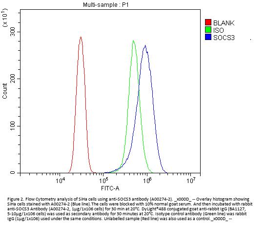 Boster Bio Anti-SOCS3 Antibody Picoband® catalog # A00274-2. Tested in ELISA, Flow Cytometry, WB applications. This antibody reacts with Human, Mouse, Rat. The brand Picoband indicates this is a premium antibody that guarantees superior quality, high affinity, and strong signals with minimal background in Western blot applications. Only our best-performing antibodies are designated as Picoband, ensuring unmatched performance.