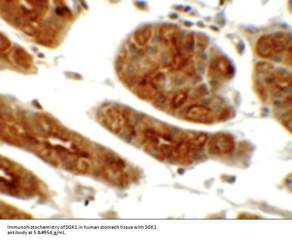 SGK1 antibody was raised against an 18 amino acid synthetic peptide near the carboxy terminus of human SGK1. The immunogen is located within amino acids 370 - 420 of SGK1.