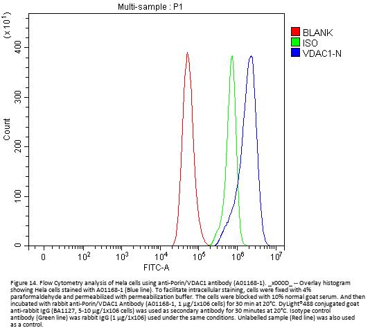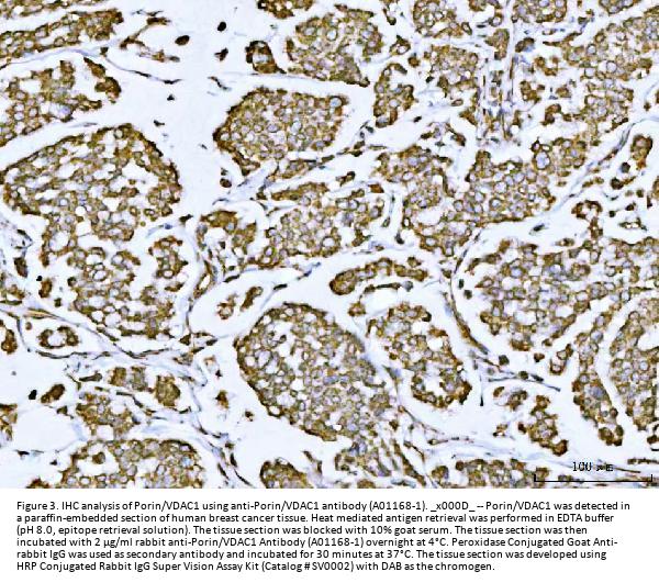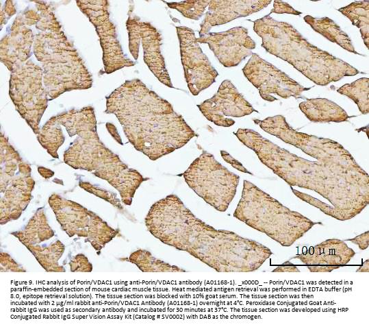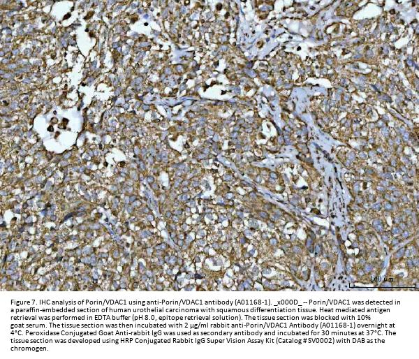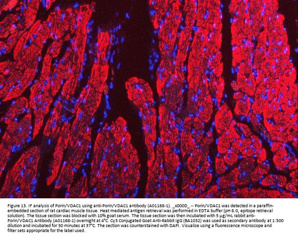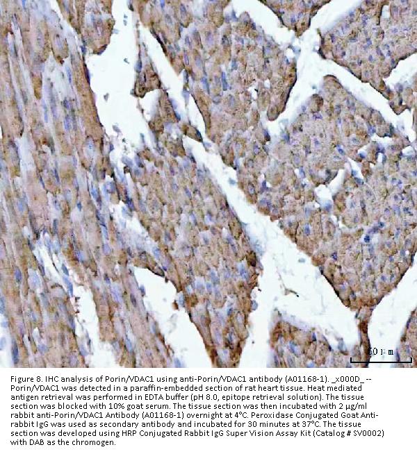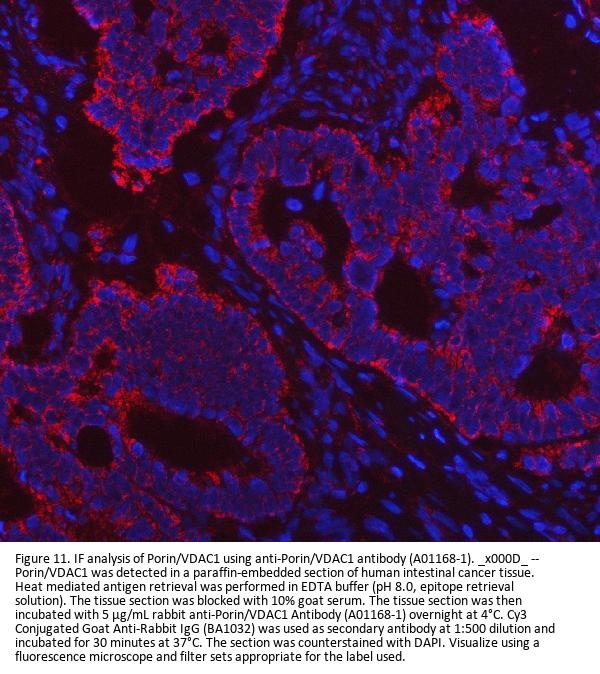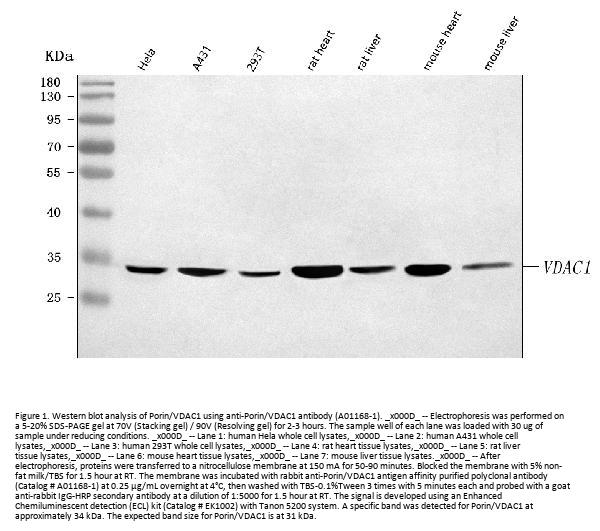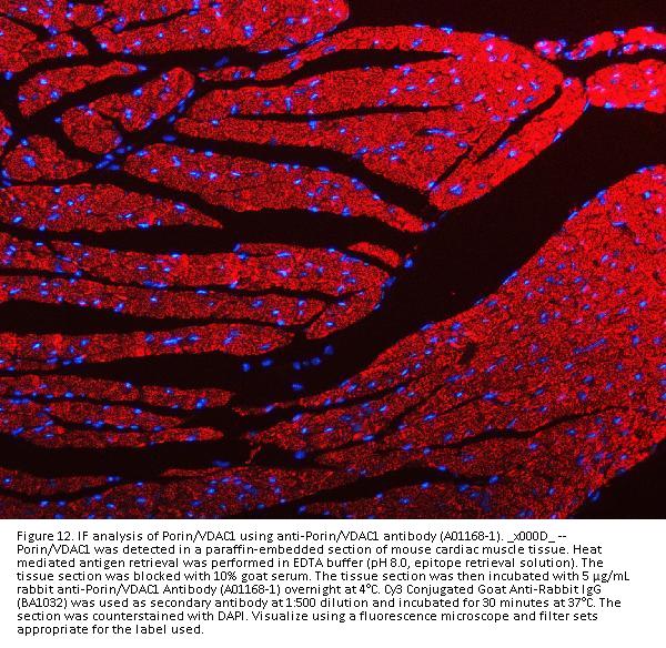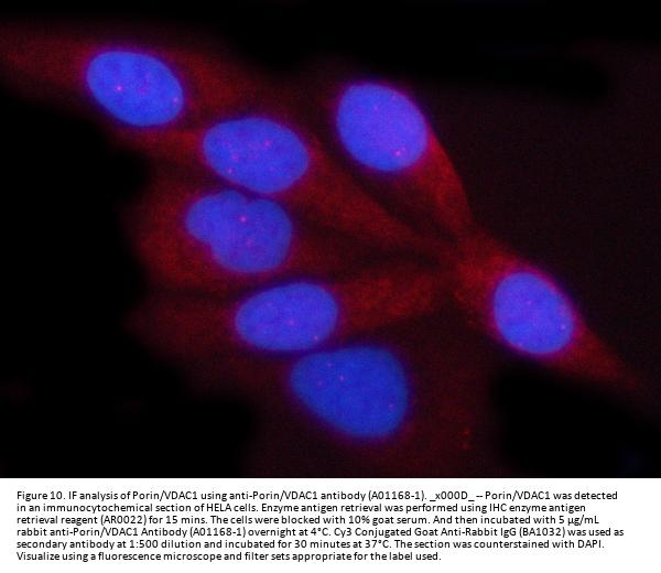 Boster Bio Anti-Porin/VDAC1 Antibody Picoband® catalog # A01168-1. Tested in ELISA, Flow Cytometry, IF, IHC, ICC, WB applications. This antibody reacts with Human, Mouse, Rat. The brand Picoband indicates this is a premium antibody that guarantees superior quality, high affinity, and strong signals with minimal background in Western blot applications. Only our best-performing antibodies are designated as Picoband, ensuring unmatched performance.