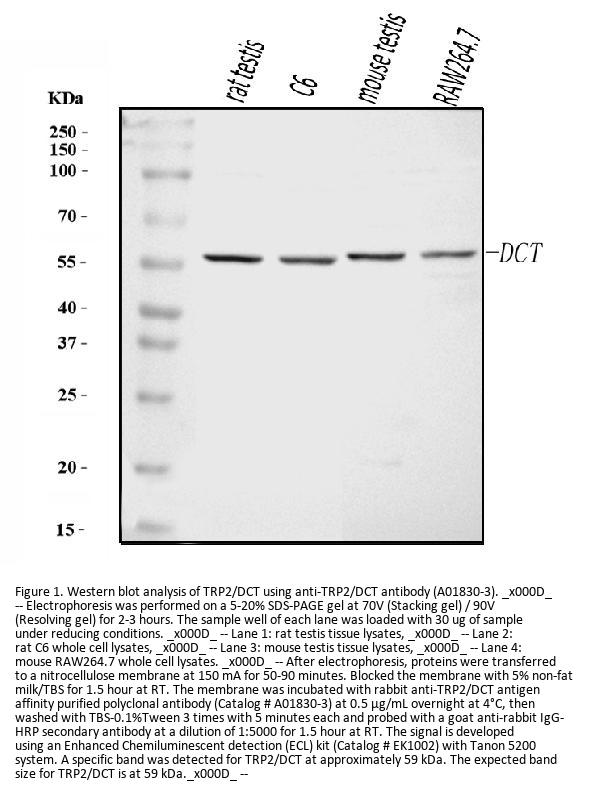 Boster Bio Anti-TRP2/DCT Antibody Picoband® catalog # A01830-3. Tested in ELISA, Flow Cytometry, WB applications. This antibody reacts with Human, Mouse, Rat. The brand Picoband indicates this is a premium antibody that guarantees superior quality, high affinity, and strong signals with minimal background in Western blot applications. Only our best-performing antibodies are designated as Picoband, ensuring unmatched performance.